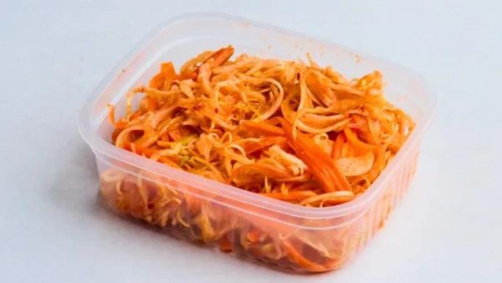 Fritert scampi, salat, agurk, gulrot, ingefær og chilimajones.