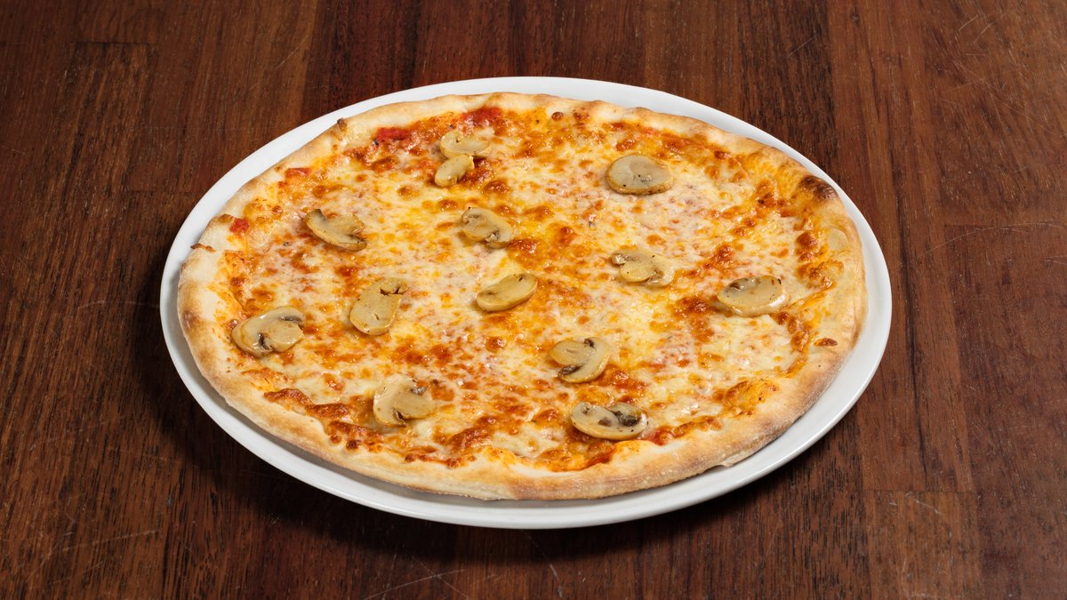 Pizza med tomatsaus, ost og champignon