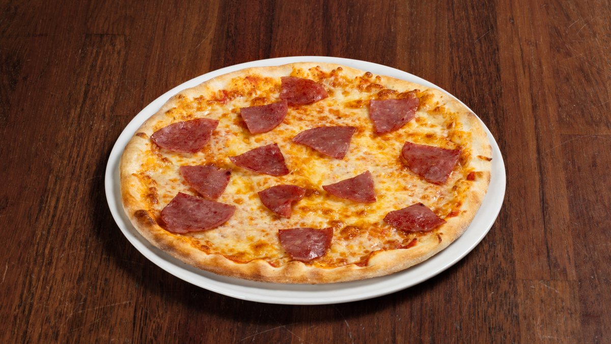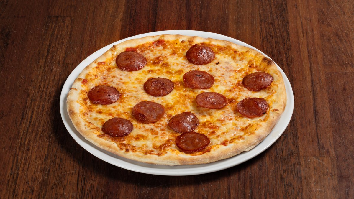 Pizza med tomatsaus, ost og pepperoni
