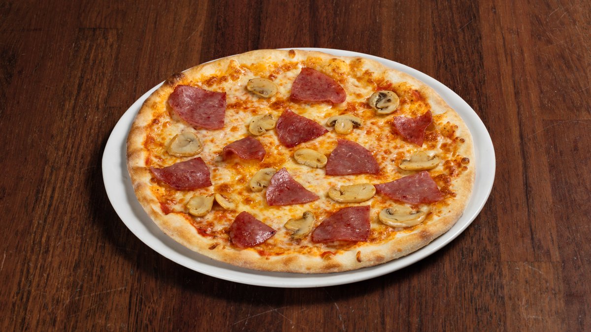 Pizza med tomatsaus, ost, skinke og champignon