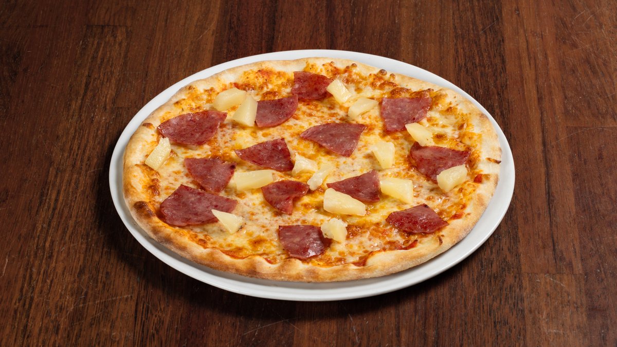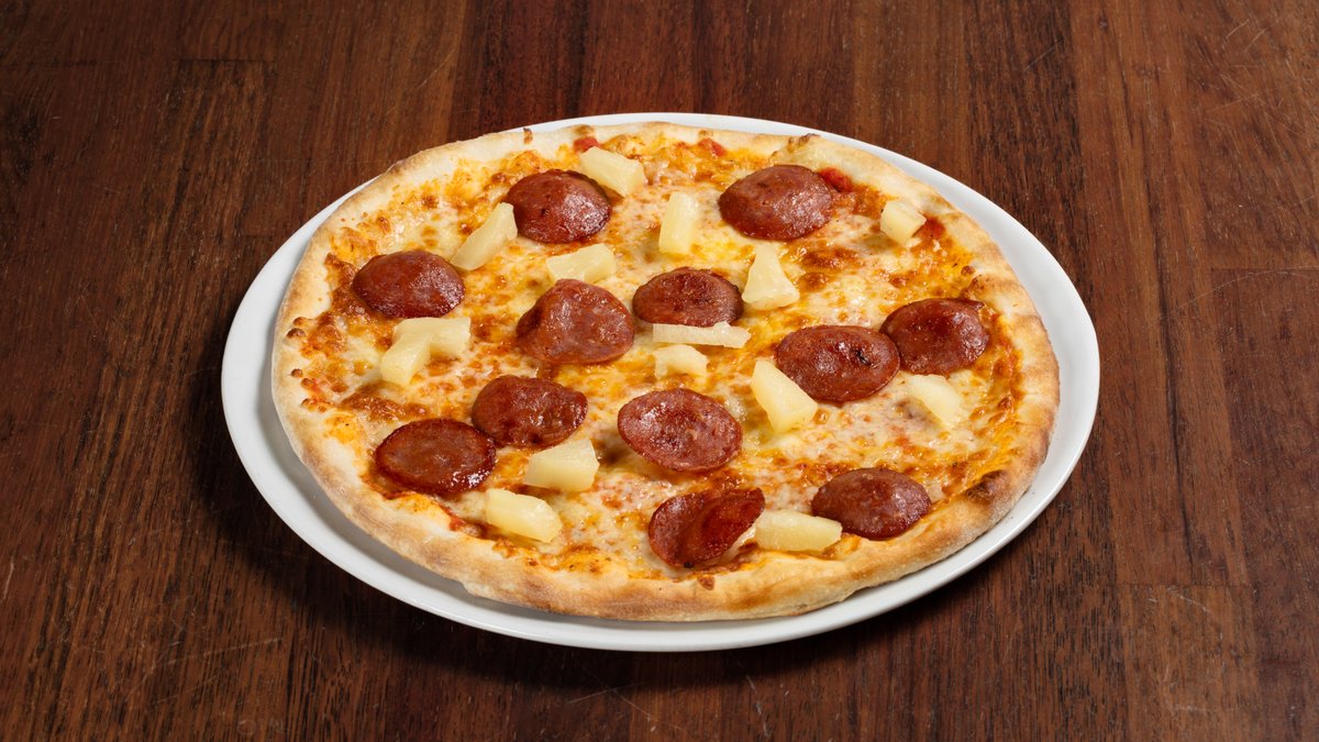 Pizza med tomatsaus, ost, pepperoni og ananas