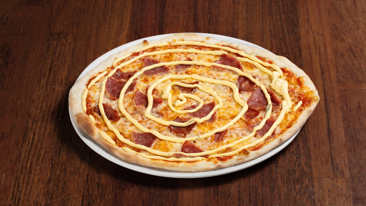 Pizza med tomatsaus, ost, skinke, kyllingbacon og bearnaisesaus