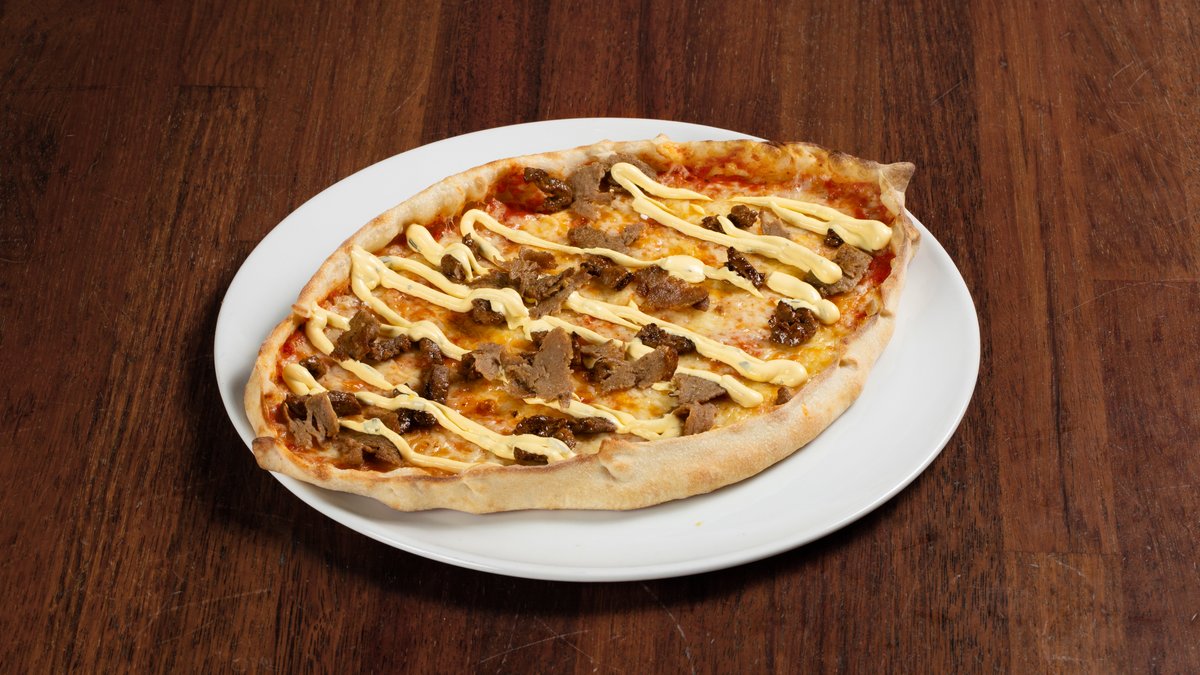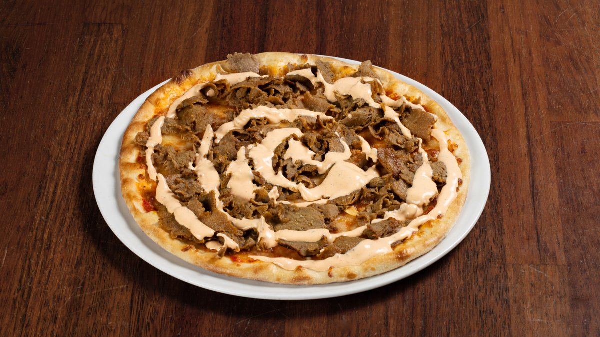 Pizza med tomatsaus, ost, kebabkjøtt og kebabsaus