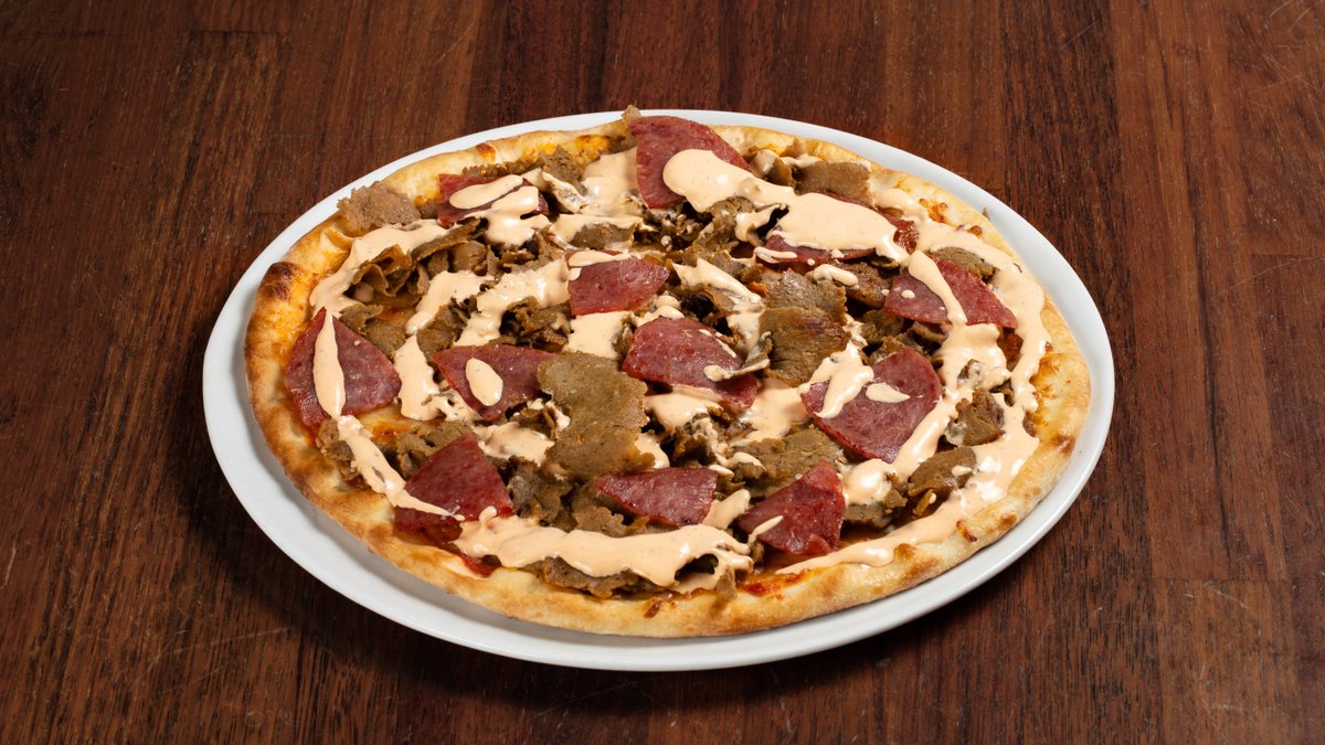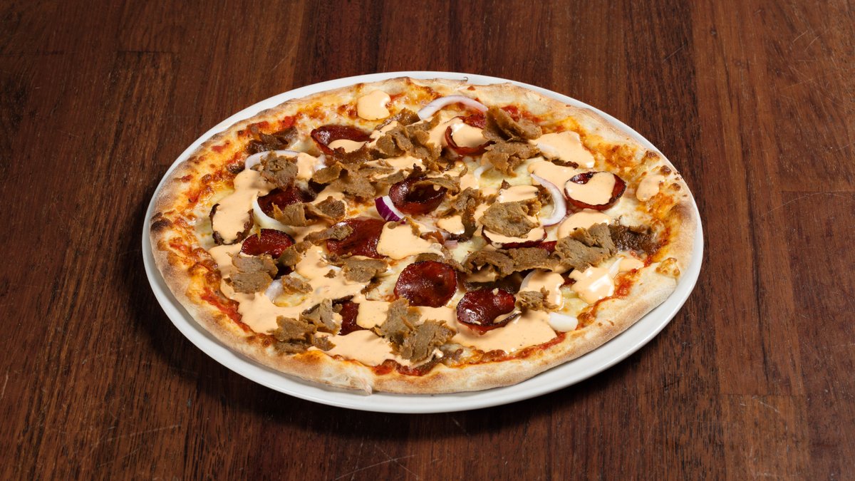 Pizza med tomatsaus, ost, pepperoni, løk, kebabkjøtt og kebabsaus.