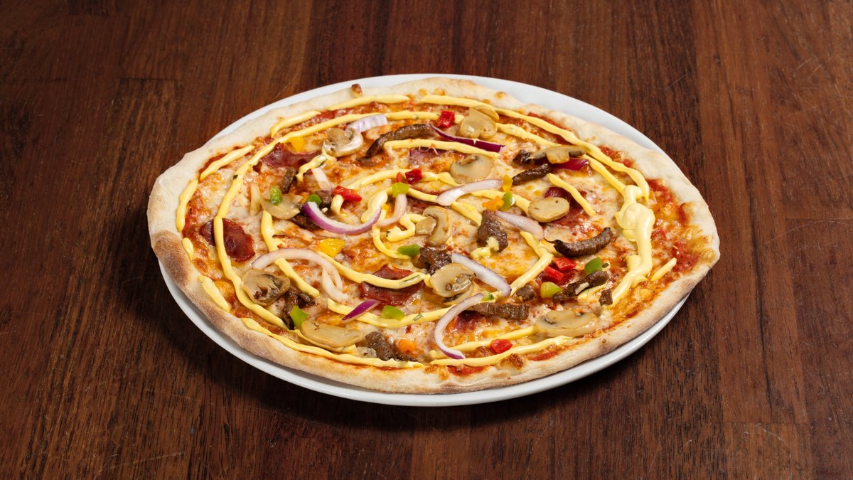 Pizza med tomatsaus, ost, biffkjøtt, kyllingbacon, løk, champignon, paprika og bearnaisesaus