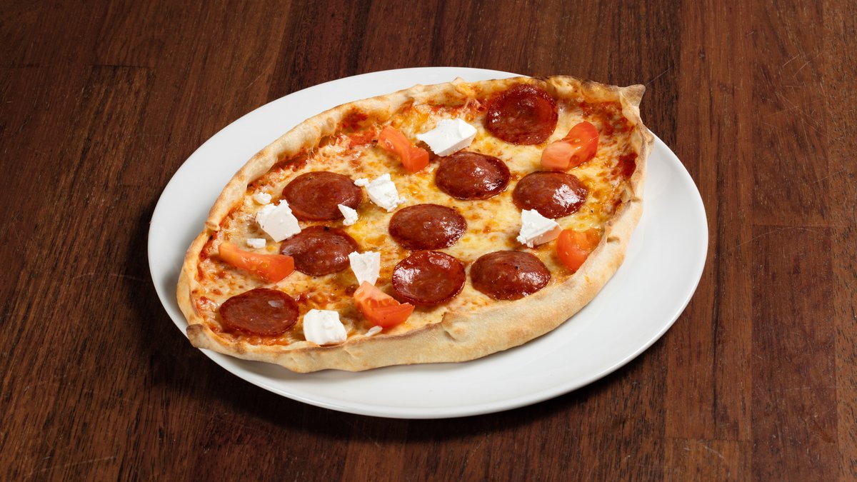 Pide med tomatsaus, ost, pepperoni, tomat og fetaost