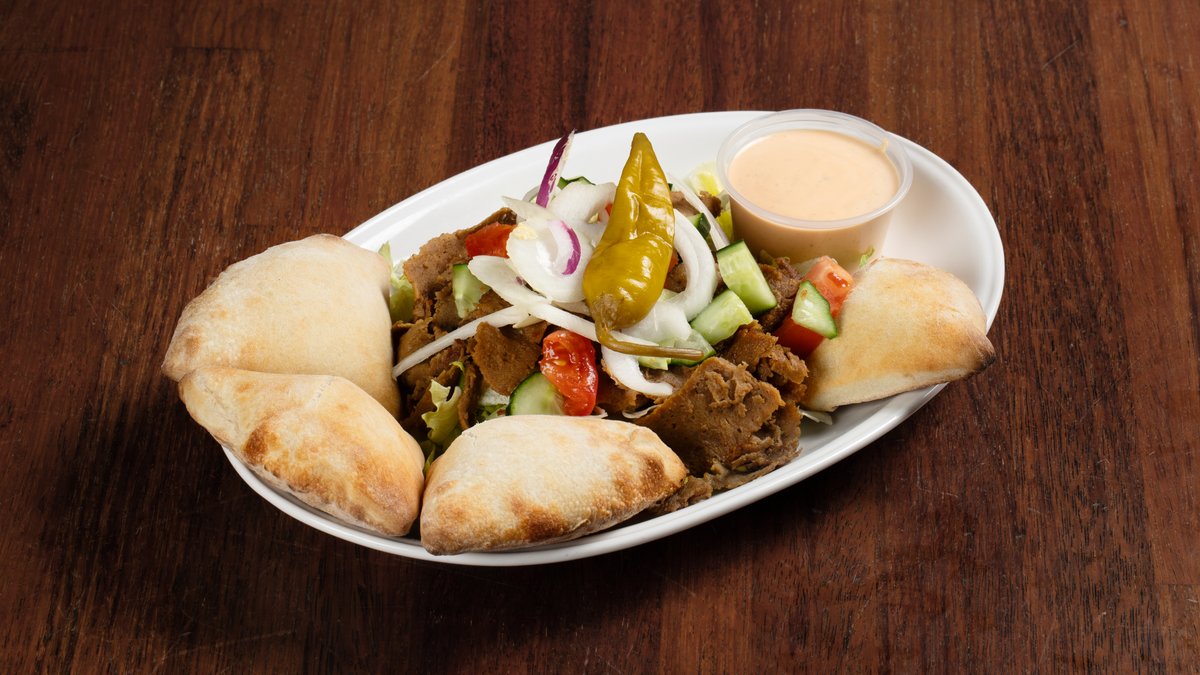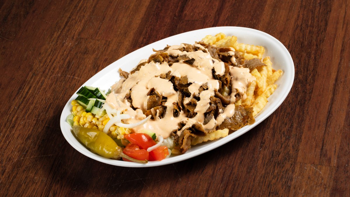 Gyro med kebabkjøtt, fries og kebabsaus