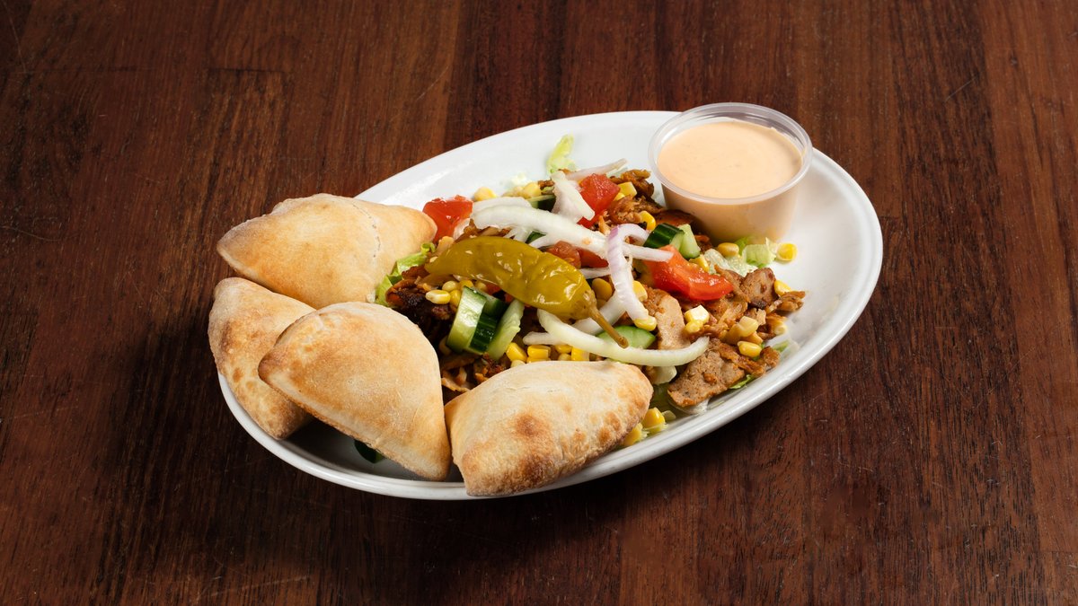 Brød i biter med blandet salat, ananas, kebabkjøtt og hvitløkssaus