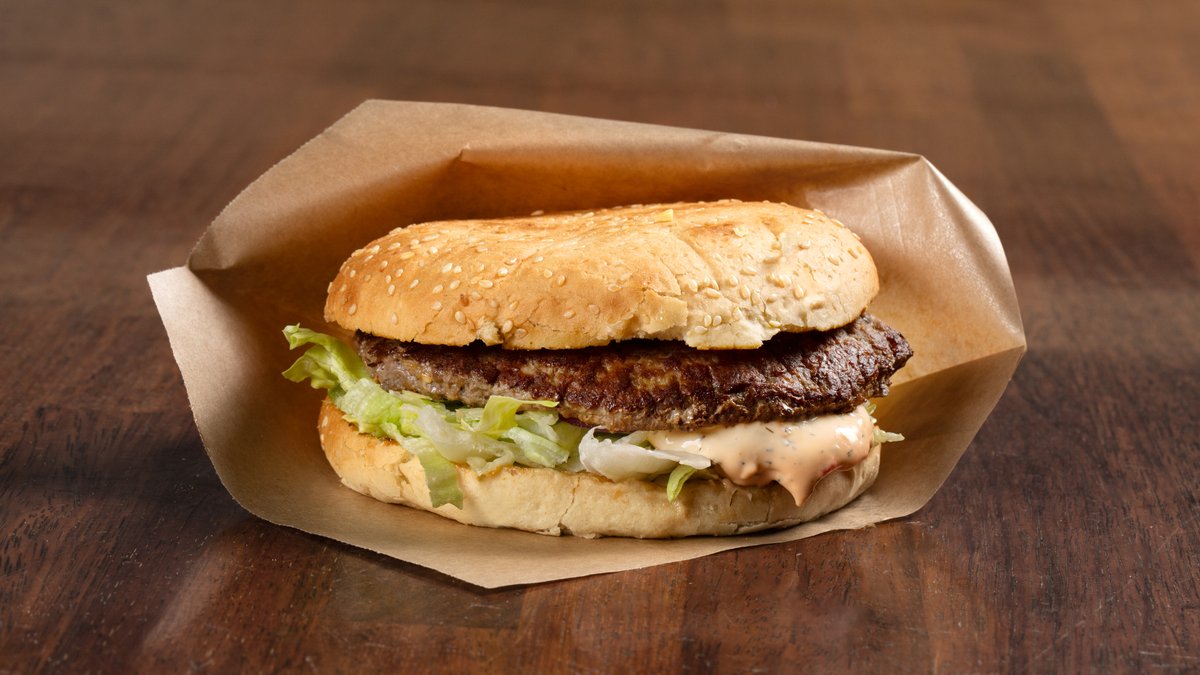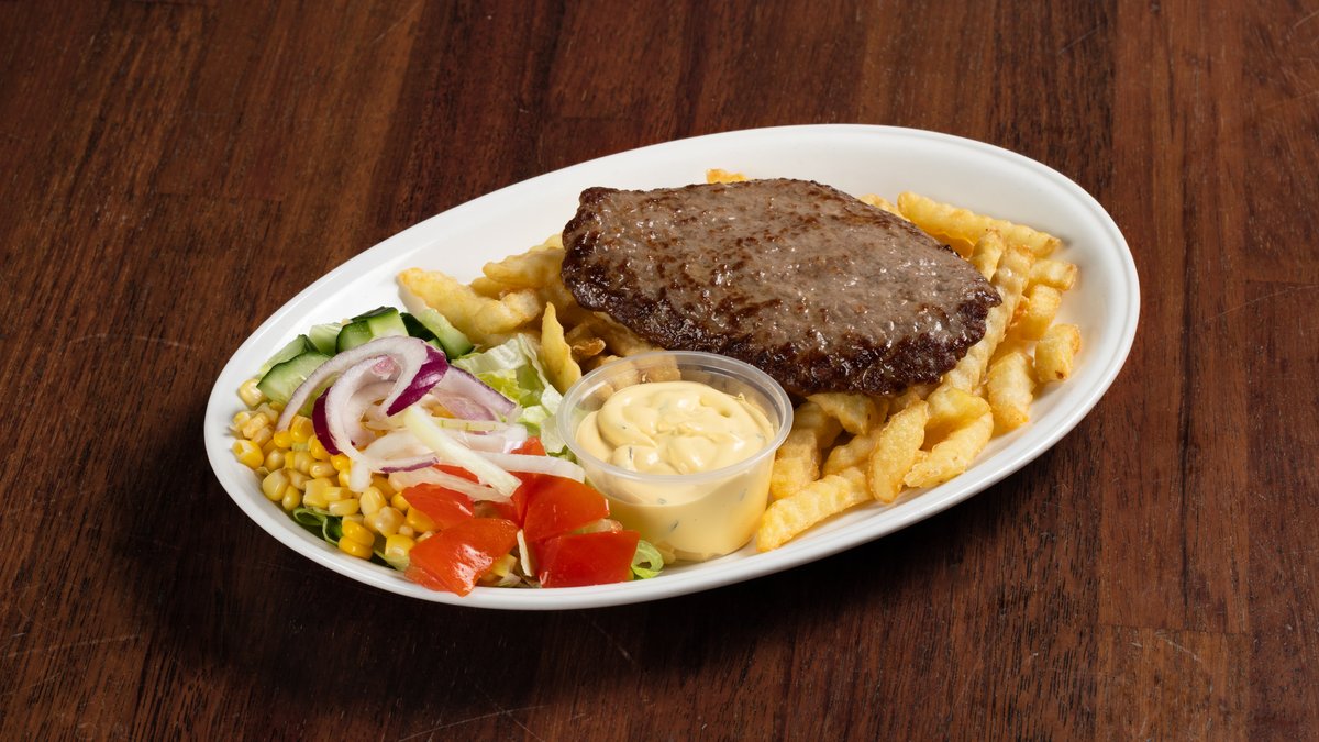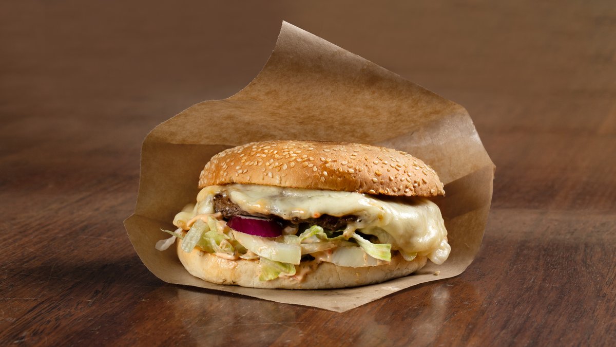 Hamburger med salat, løk, ost og dressing Velg størrelse under Avbildet er 190g hamburger