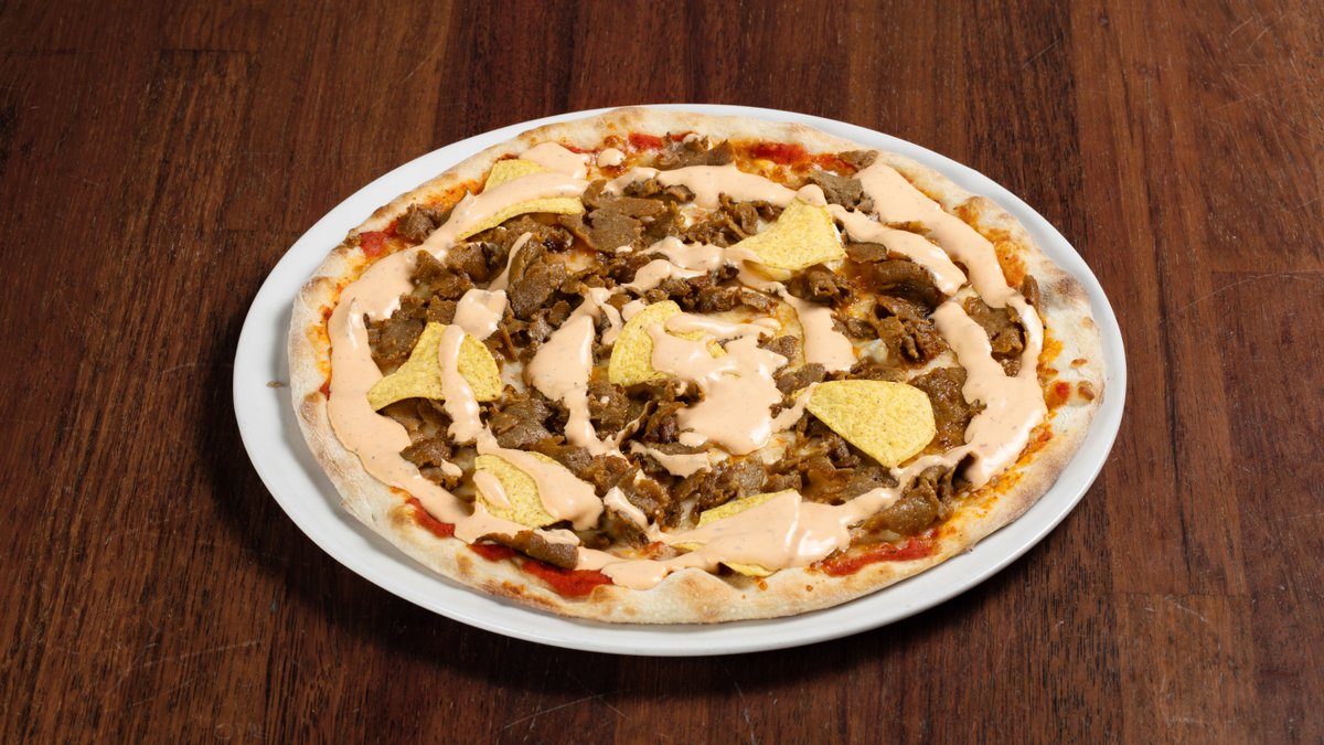 Pizza med tomatsaus, ost, kebabkjøtt, torillachips og kebabsaus