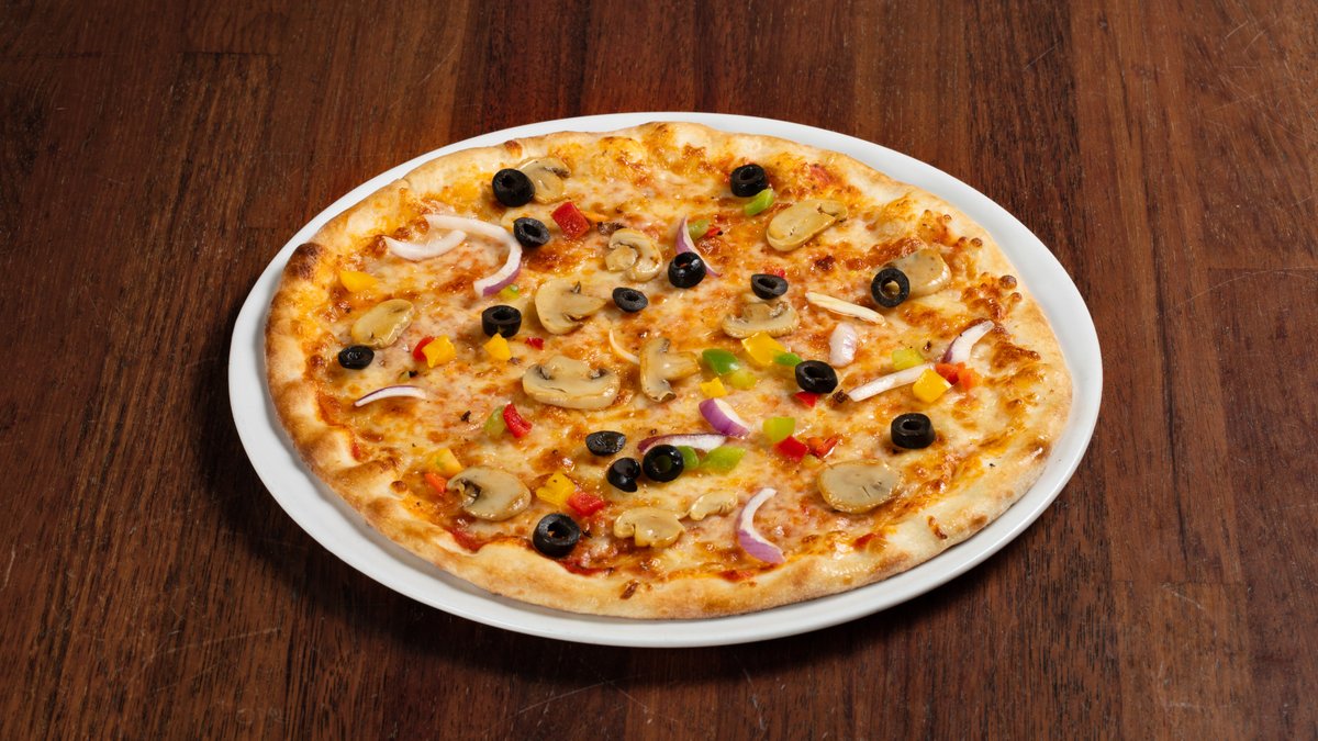 Pizza med tomatsaus, ost, paprika, løk, champignon og oliven