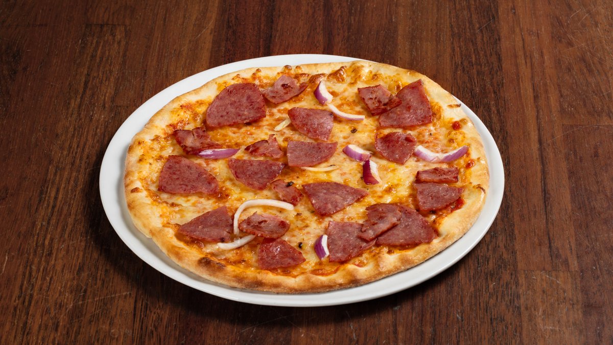 Pizza med tomatsaus, ost, pepperoni, kyllingbacon, løk og tomater