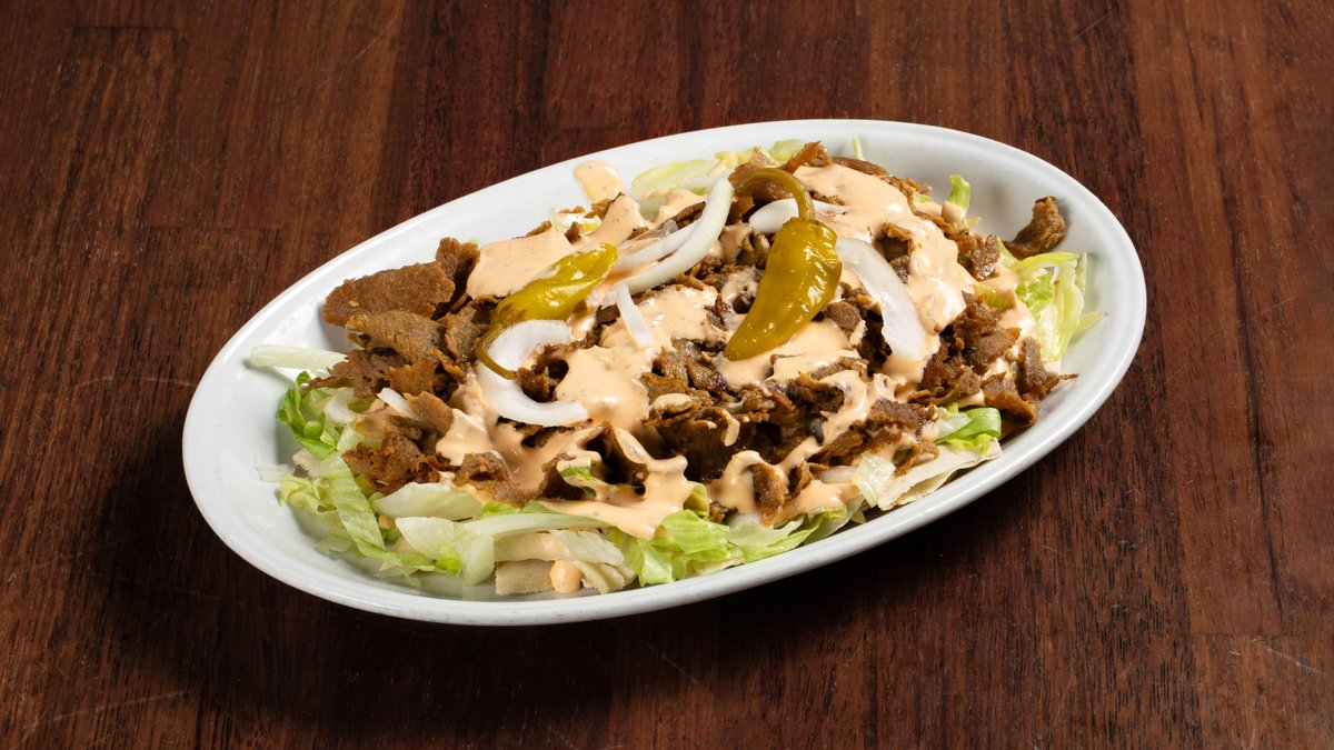 Pommes frites med blandet salat, kebabkjøtt og kebabsaus