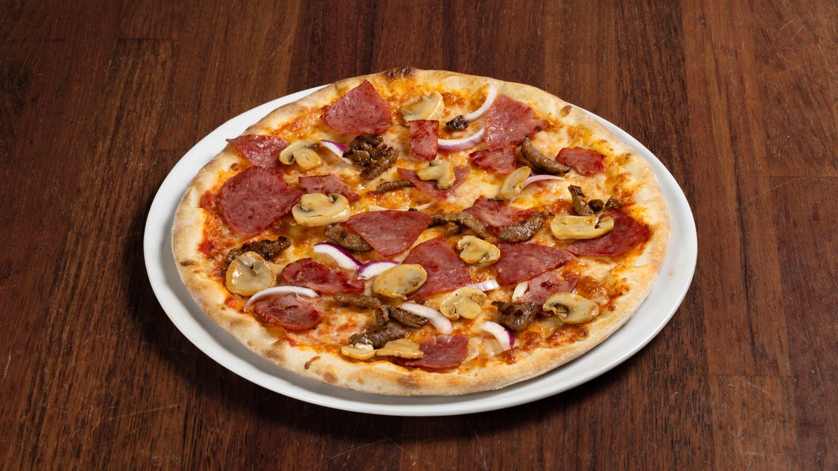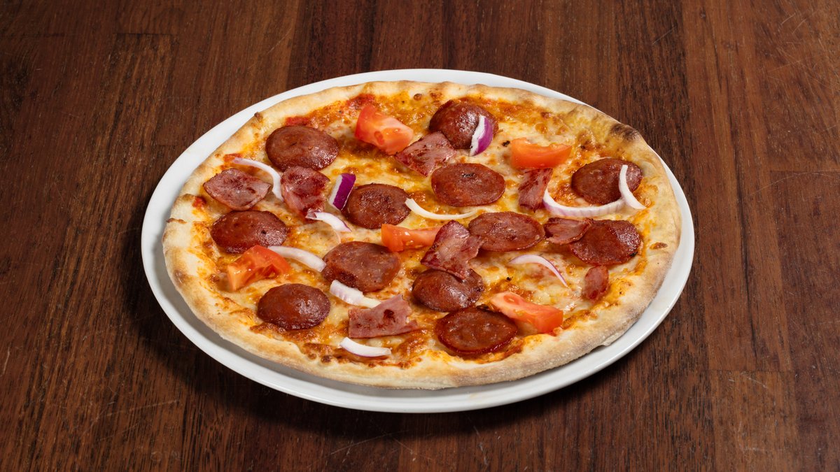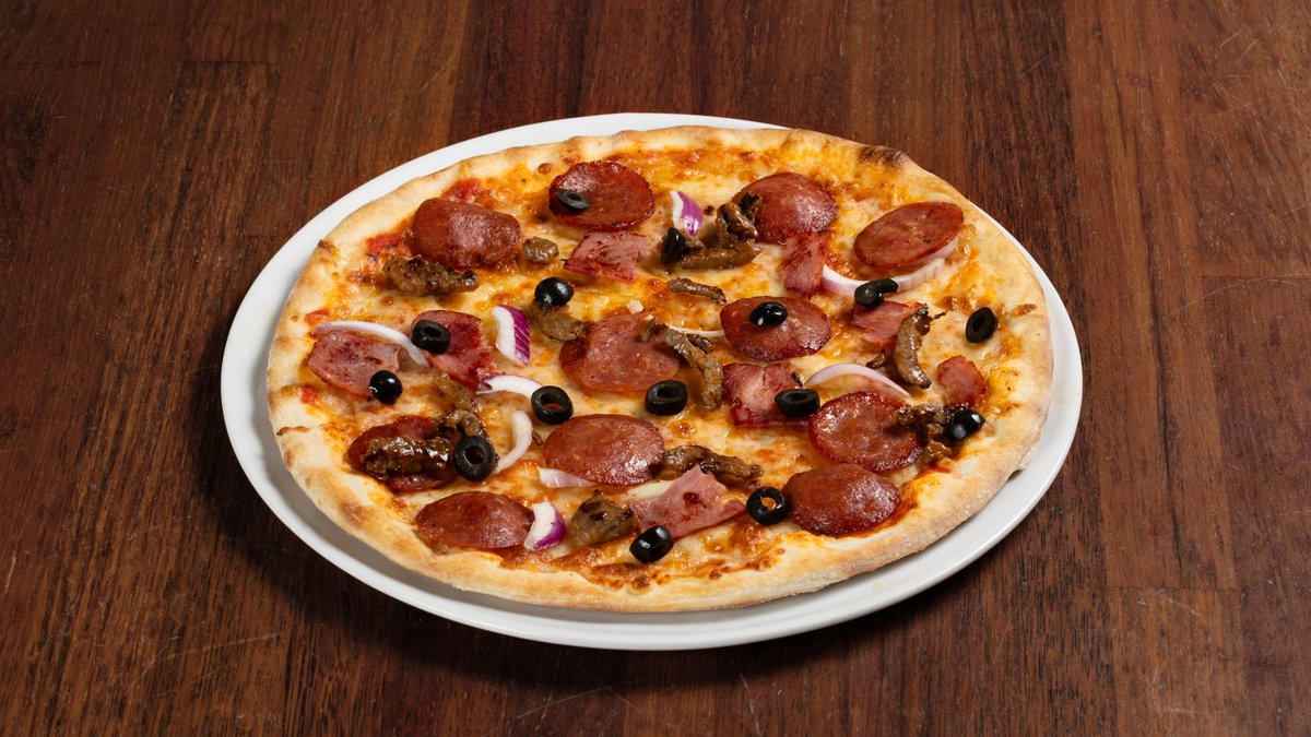 Pizza med tomatsaus, ost, pepperoni, biff, kyllingbacon, løk og oliven.