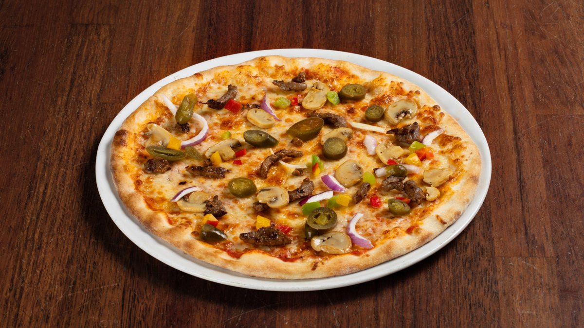 Pizza med tomatsaus, ost, biff, champignon, paprika, løk og jalapeños.
