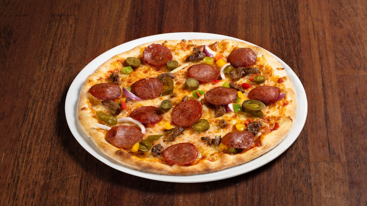 Pizza med tomatsaus, ost, biffkjøtt, paprika, jalapeños, løk og salami