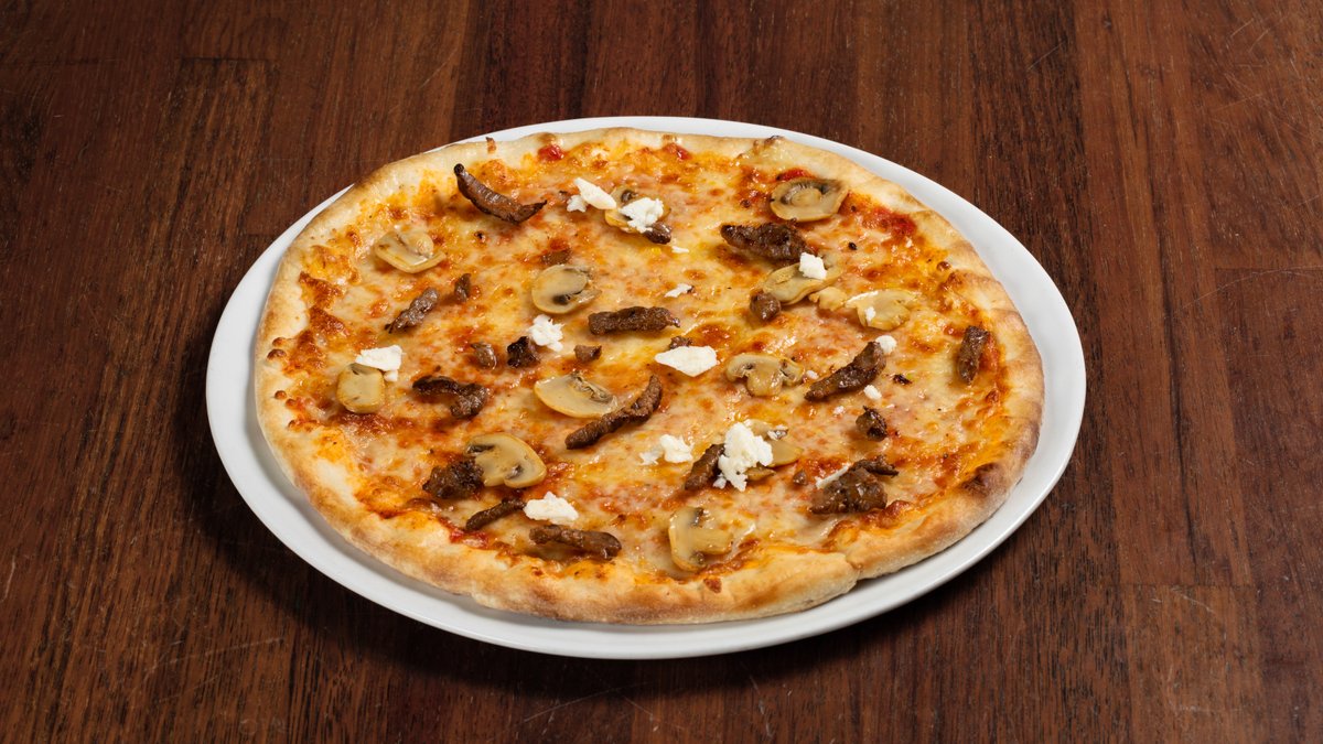 Pizza med tomatsaus, ost, biffkjøtt, champignon og gorgonzola-ost