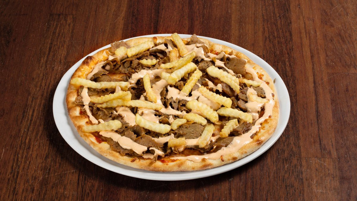 Pizza med tomatsaus, ost, kebabkjøtt, kebabsaus og pommes frites