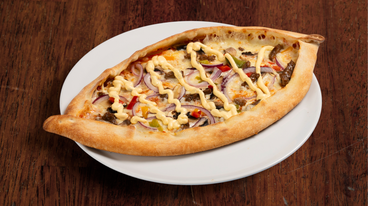 Pide med tomatsaus, ost, biffkjøtt, sjampinjong, løk, paprika og bearnaisesaus