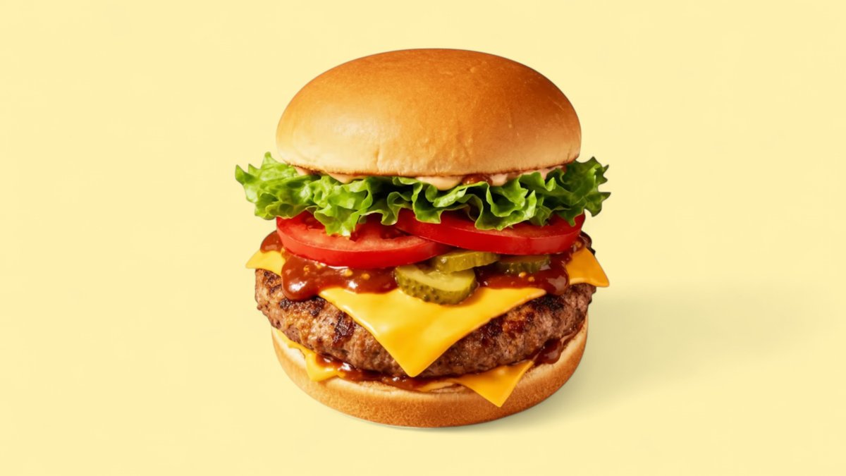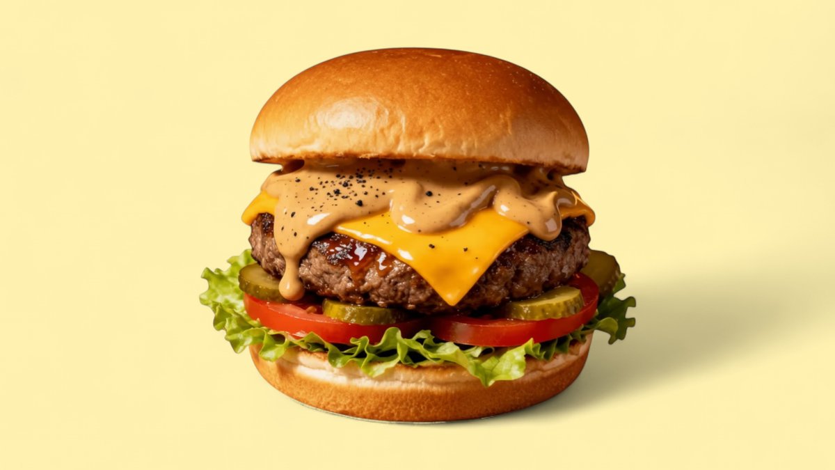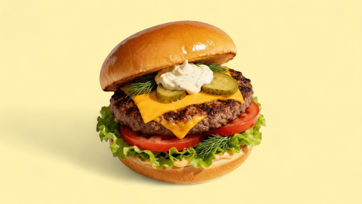 Trøffel majones, stektløk, salat, ost, og sylteagurk.
