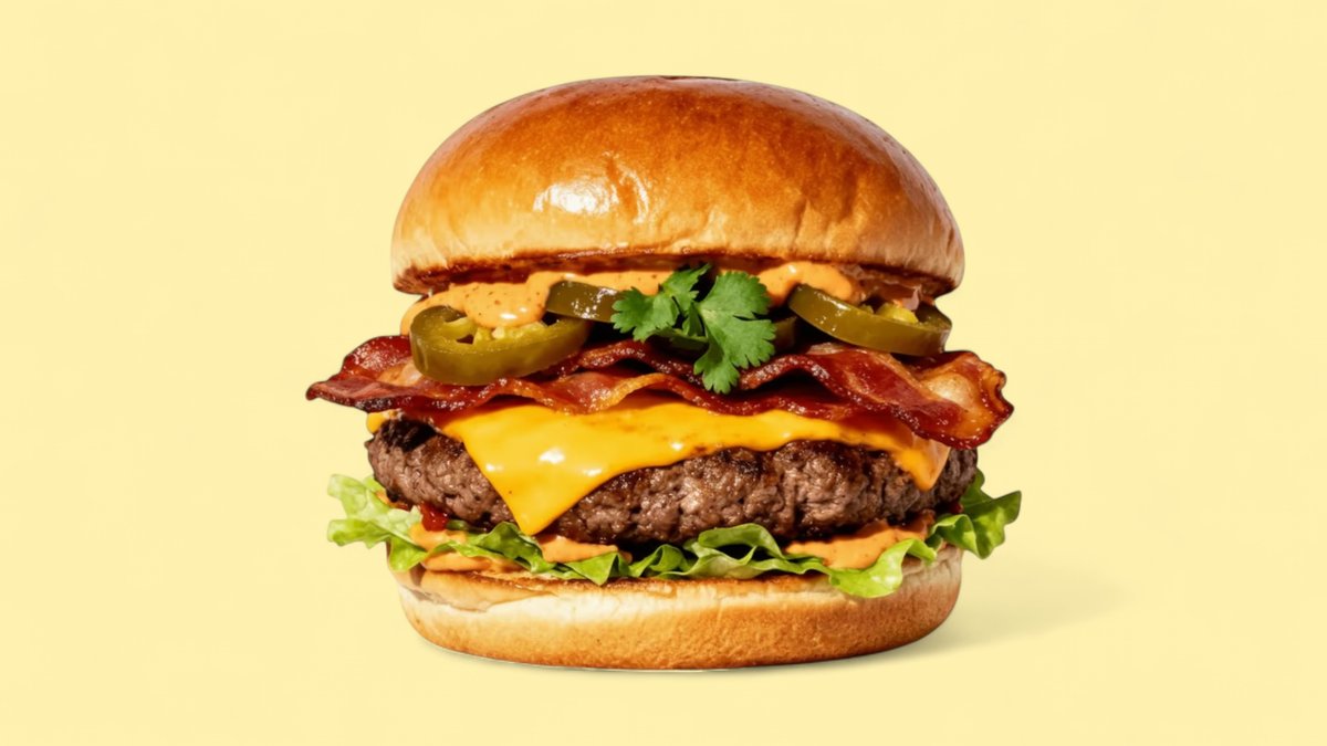BBQ saus, jalapeno, salat, rødløk, paprika og ost.