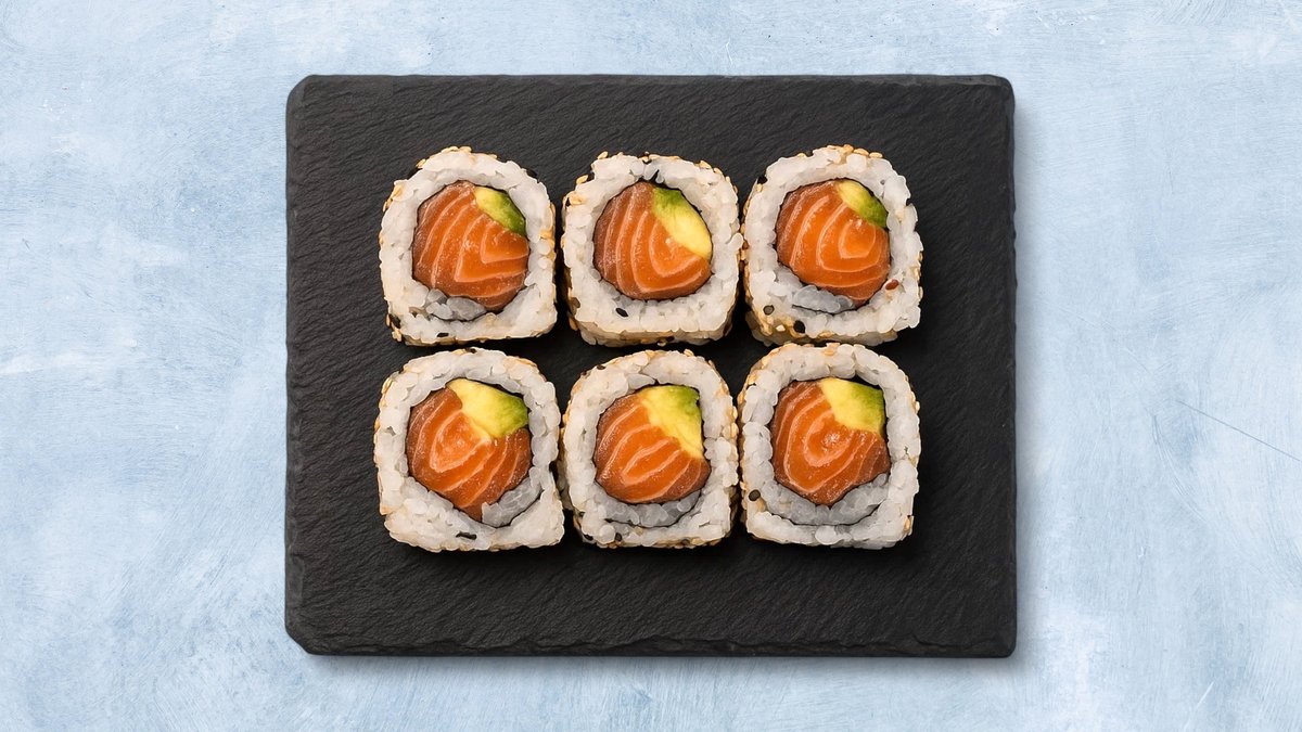 8 biter. Maki med laks, avokado og chilimajones.