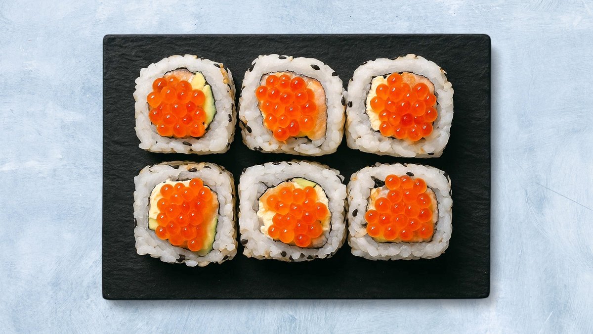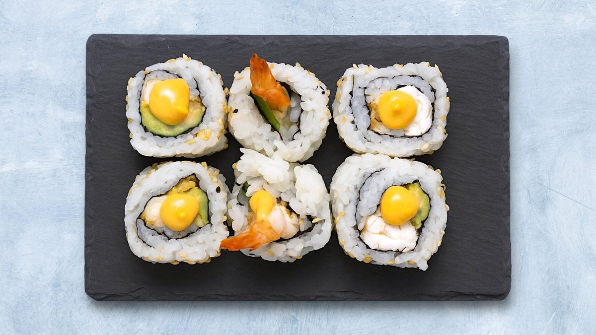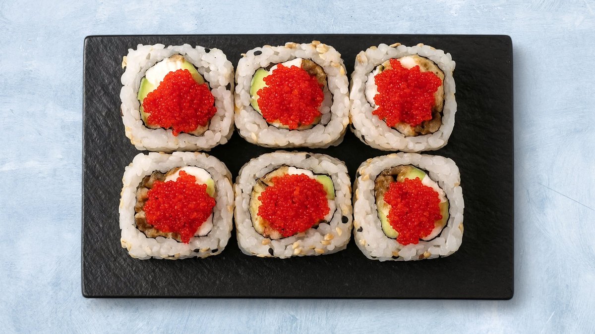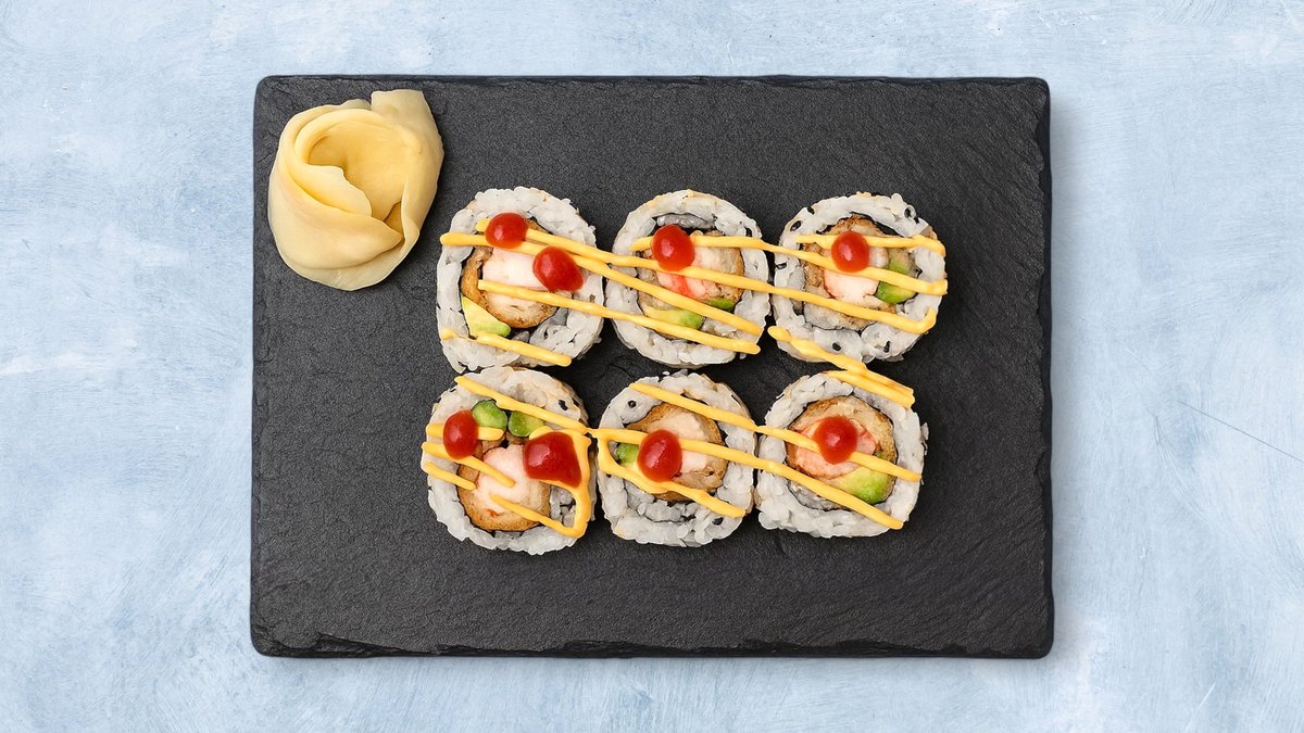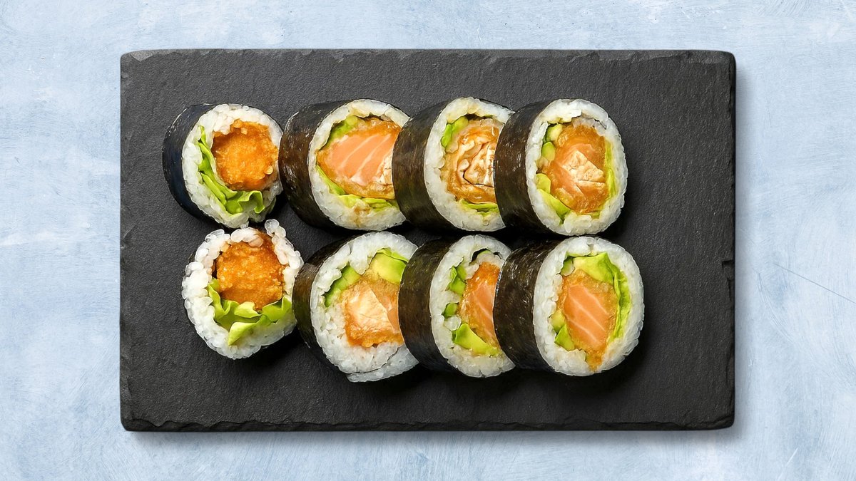 8 biter. Maki med fritert krabbe, avokado, rød tobiko og chilimajones.