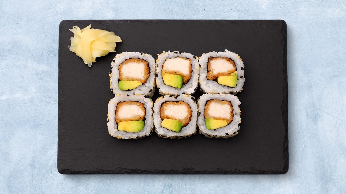 8 biter. Maki med fritert kylling, avokado og chilimajones.