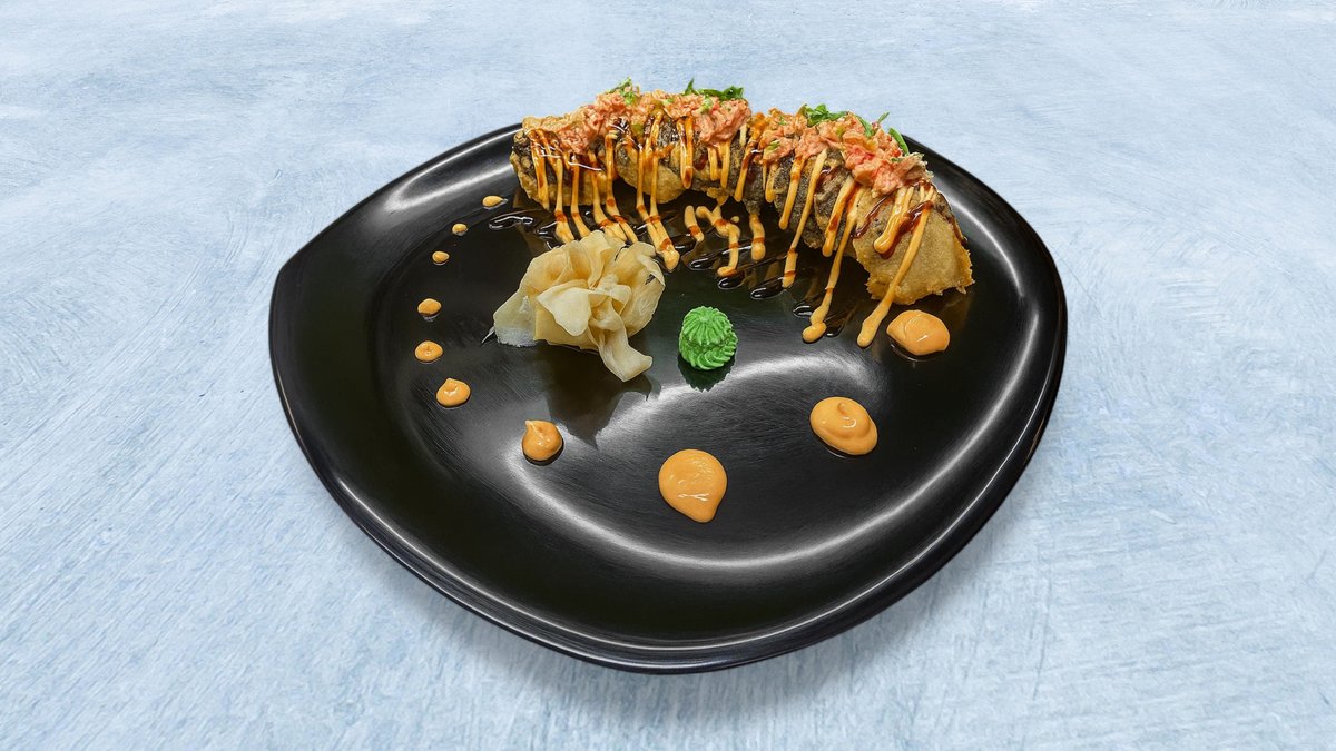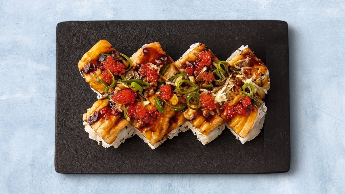 8 biter. Maki med fritert scampi, avokado og chilimajones. Toppet med lettgrillet laks, teriyakisaus, tobiko og fried onions.