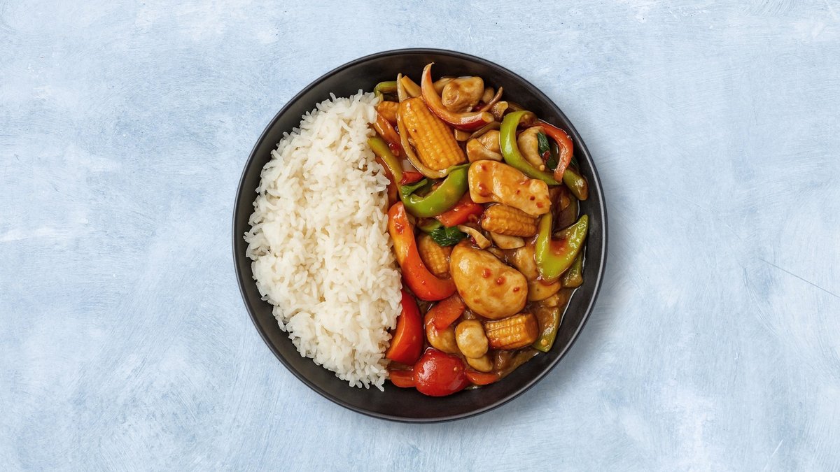 Serveres med kylling, grønnsaker, sursøt saus og ris.