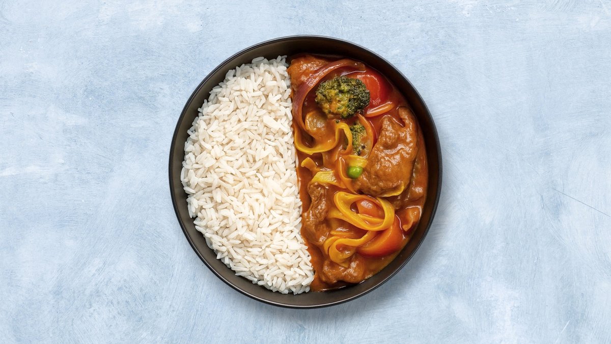 Serveres med biff, grønnsaker, sursøt saus og ris.