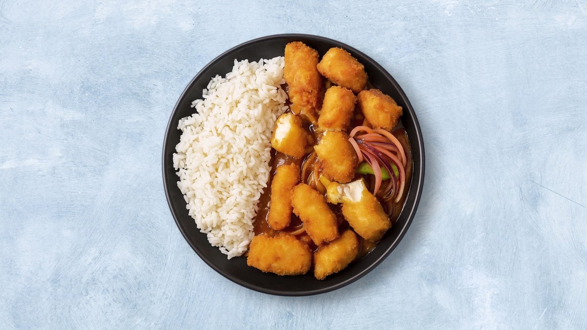 Serveres med innbakt kylling, grønnsaker, sursøt saus og ris.