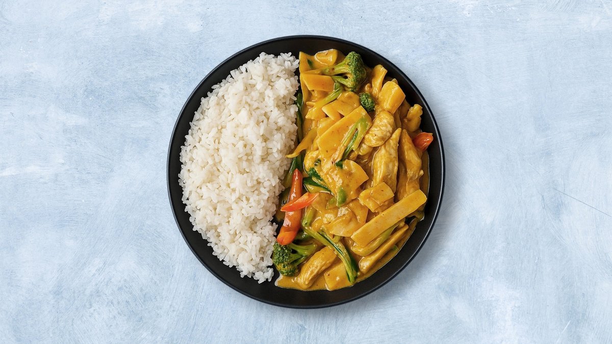 Serveres med kylling, grønnsaker, egg, ris og karrisaus.
