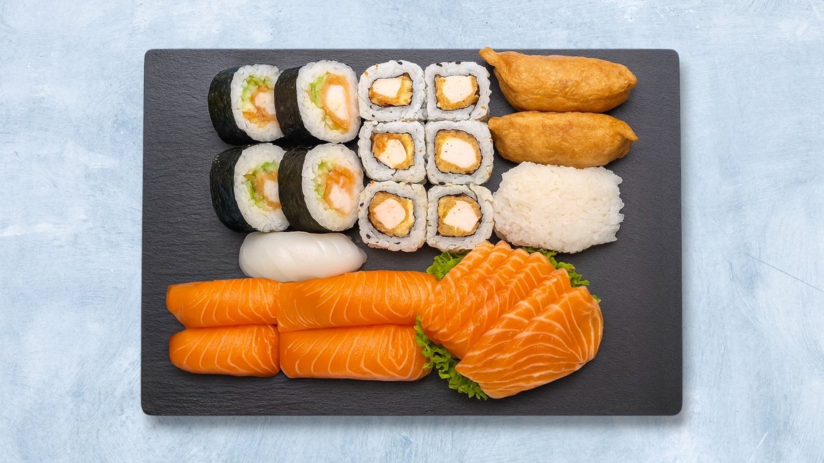 7-9 personer. 116 biter. 16 laks nigiri, 4 tuna, 4 kveite, 4 kamskjell, 4 scampi, 4 rødskjell, 8 biter laks maki, 8 Norway roll, 8 tempura maki, 8 rainbow maki, 12 skiver sashimi, 12 biter tempura futomaki, 12 kylling futomaki og 12 fujishan maki (fritert hele maki).
