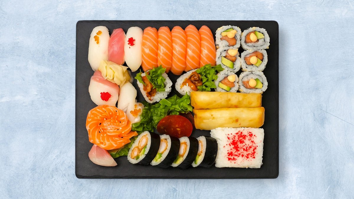 2 personer. 34 biter. 8 nigiri, 12 biter tempura futomaki, 8 biter kylling maki og 6 skiver laks sashimi. Serveres med 2 stk vårruller og 2 stk fritert banan.