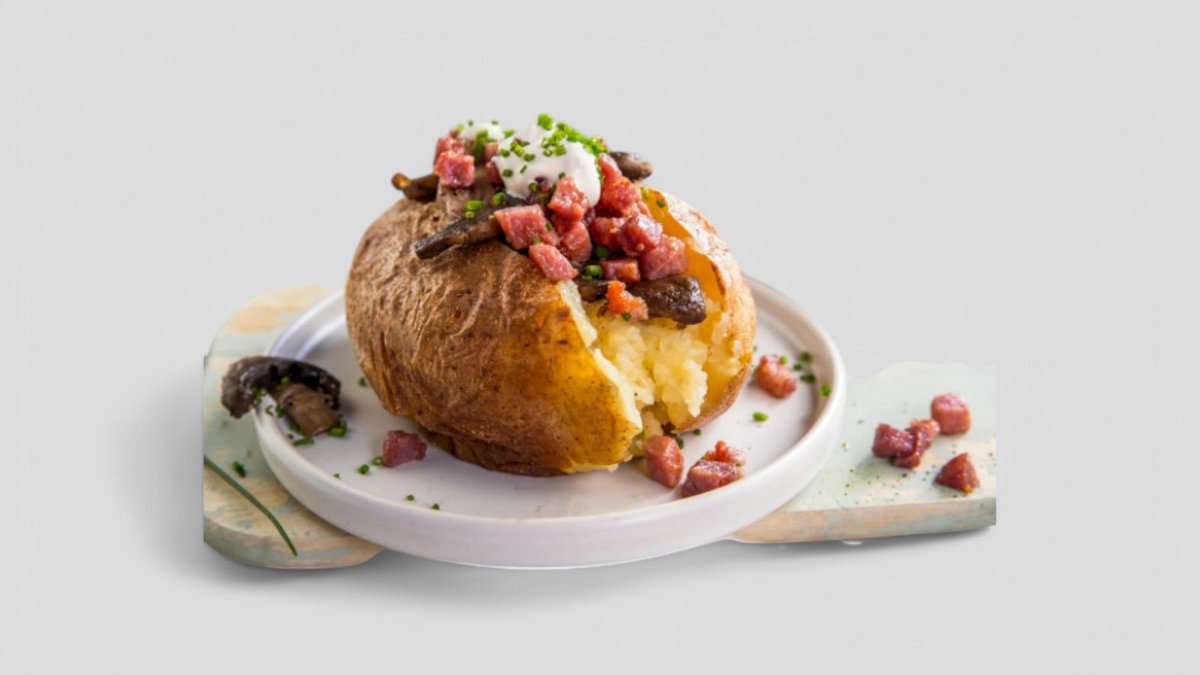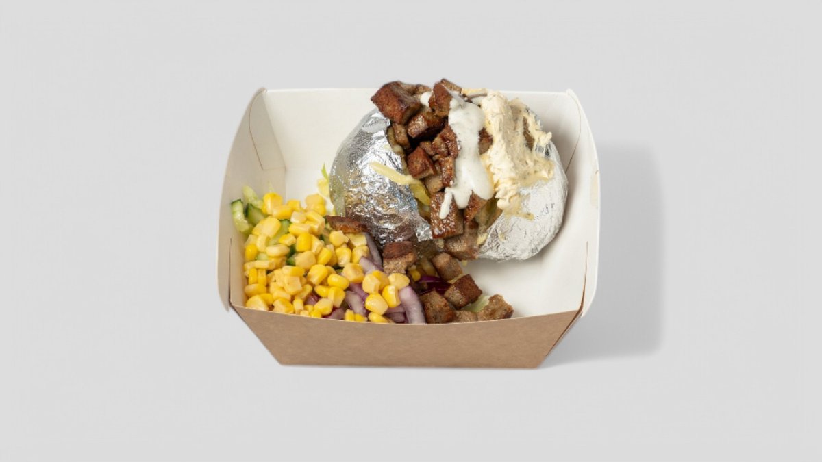 Salat, barbequesaus, løkringer, mais, tomater, cheddarost og pommes frites.