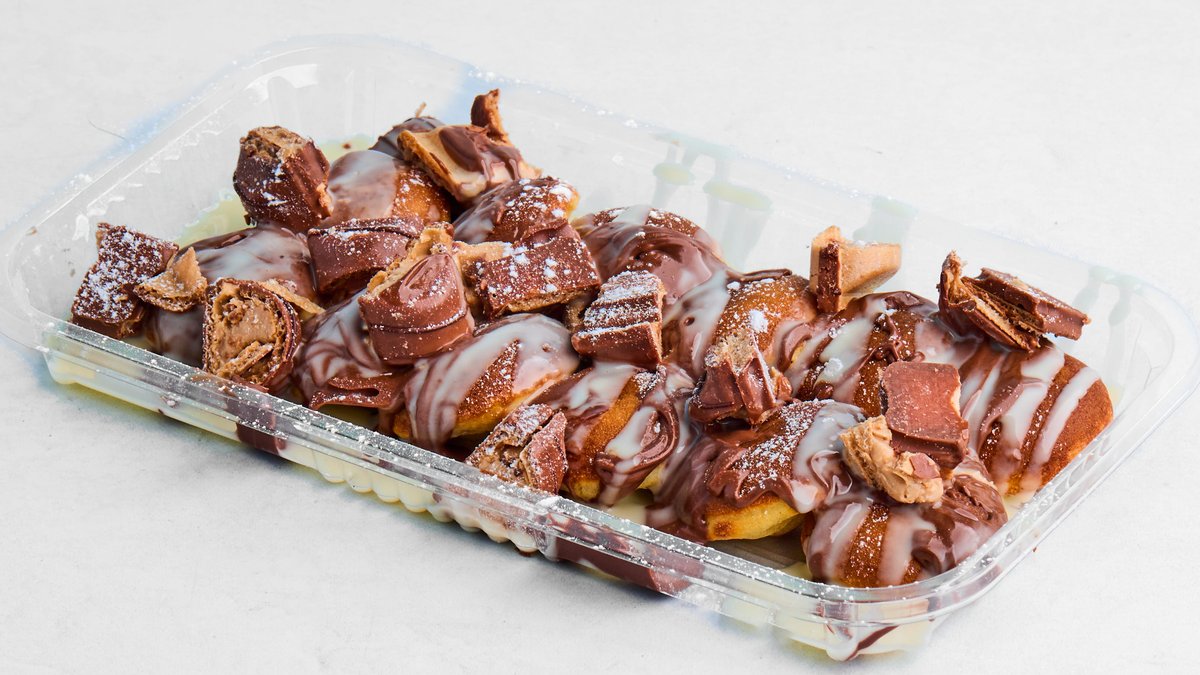 Toppet med Kinder Bueno- sjokolade, hvit sjokolade- saus og Nutella- saus.