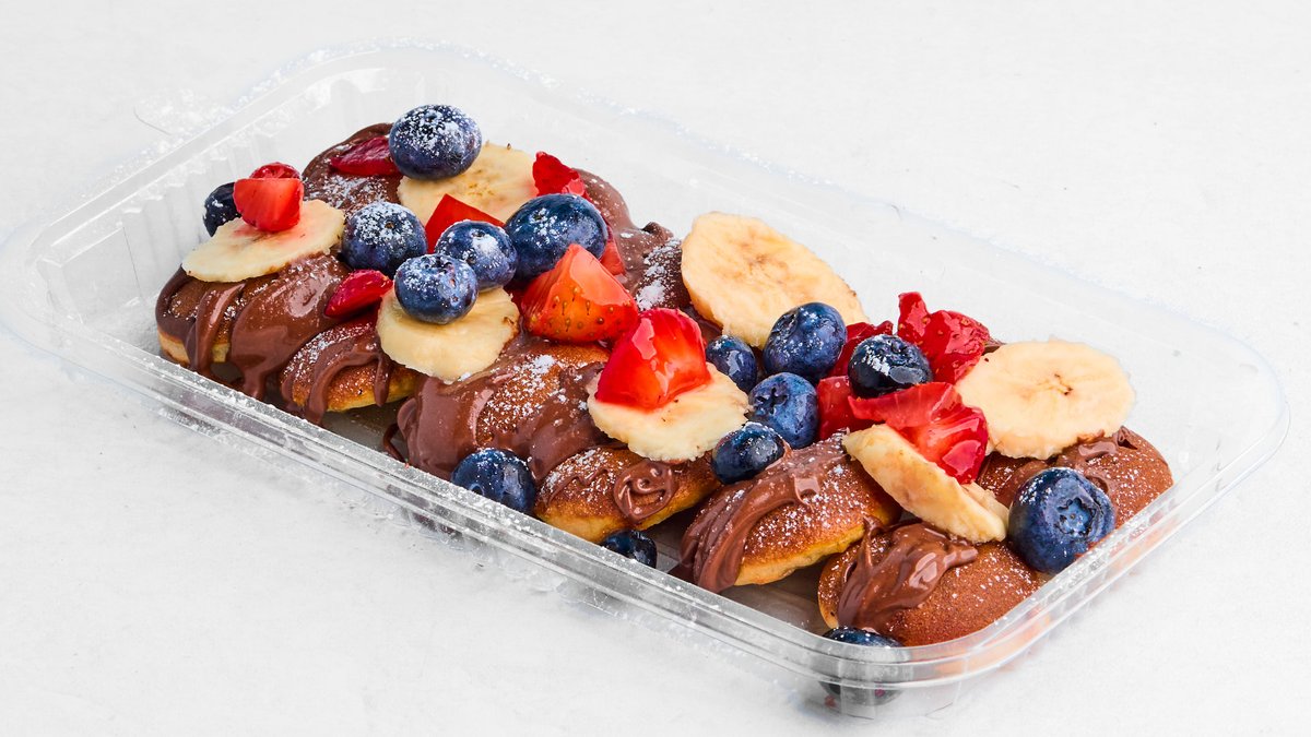 Toppet med ferske jordbær, blåbær, banan og Nutella- saus.