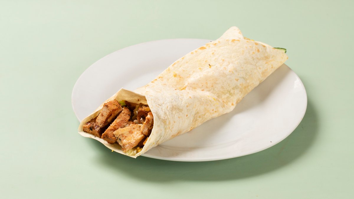 Kylling i rull med mais, agurk, tomat, løk, isbergsalat og saus.