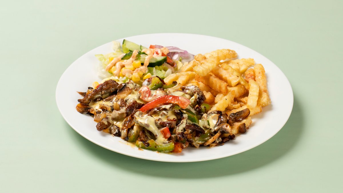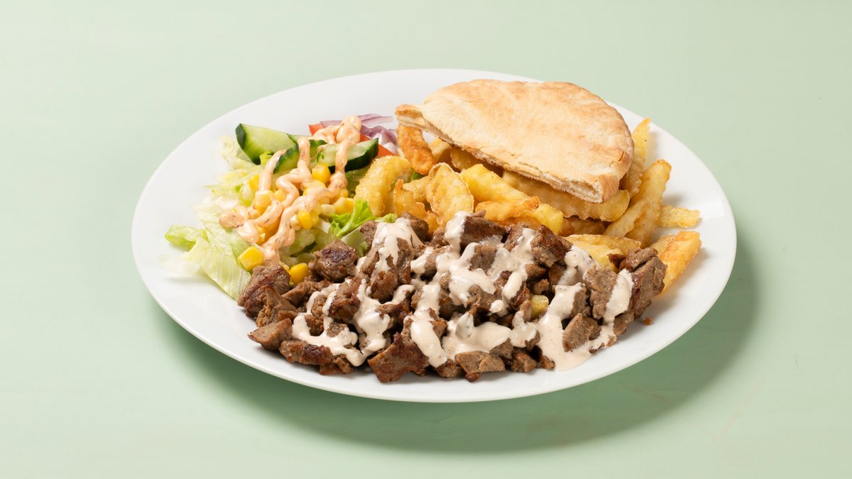 Kebabtallerken med mais, agurk, tomat, løk, isbergsalat og saus. Serveres med pommes frites.