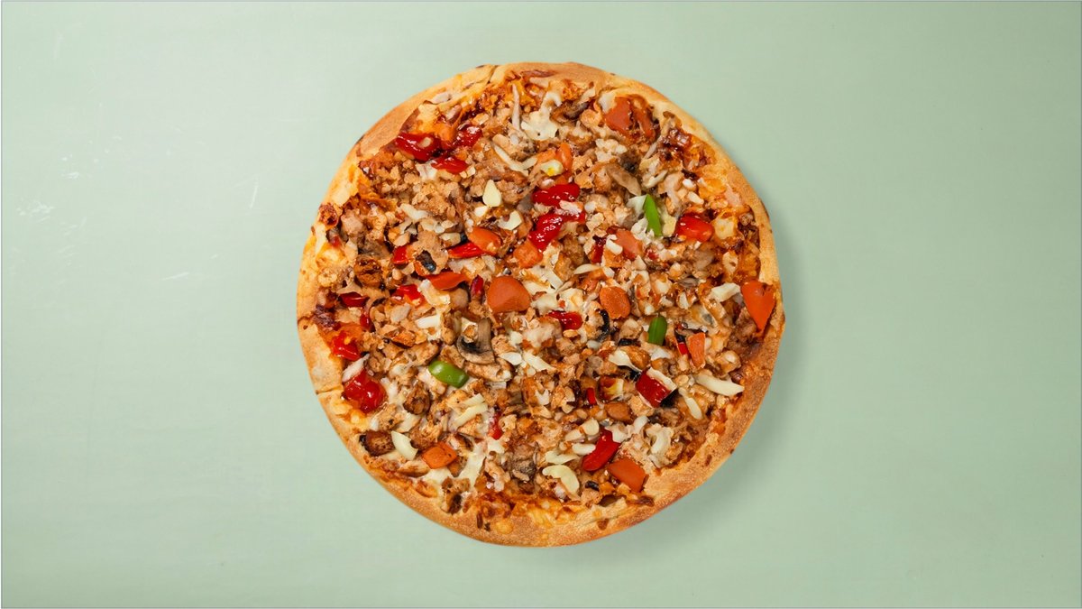 Pizza med marinert kylling, sopp, paprika, og løk.