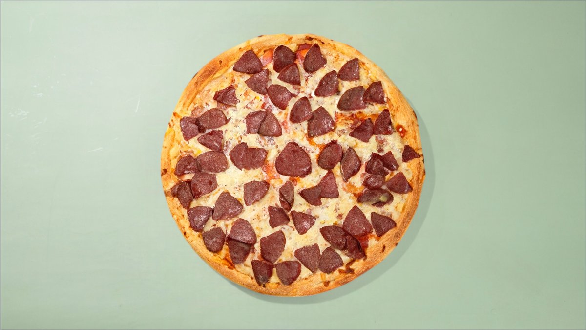 Pizza med bacon, kjøttdeig, pepperoni og løk.
