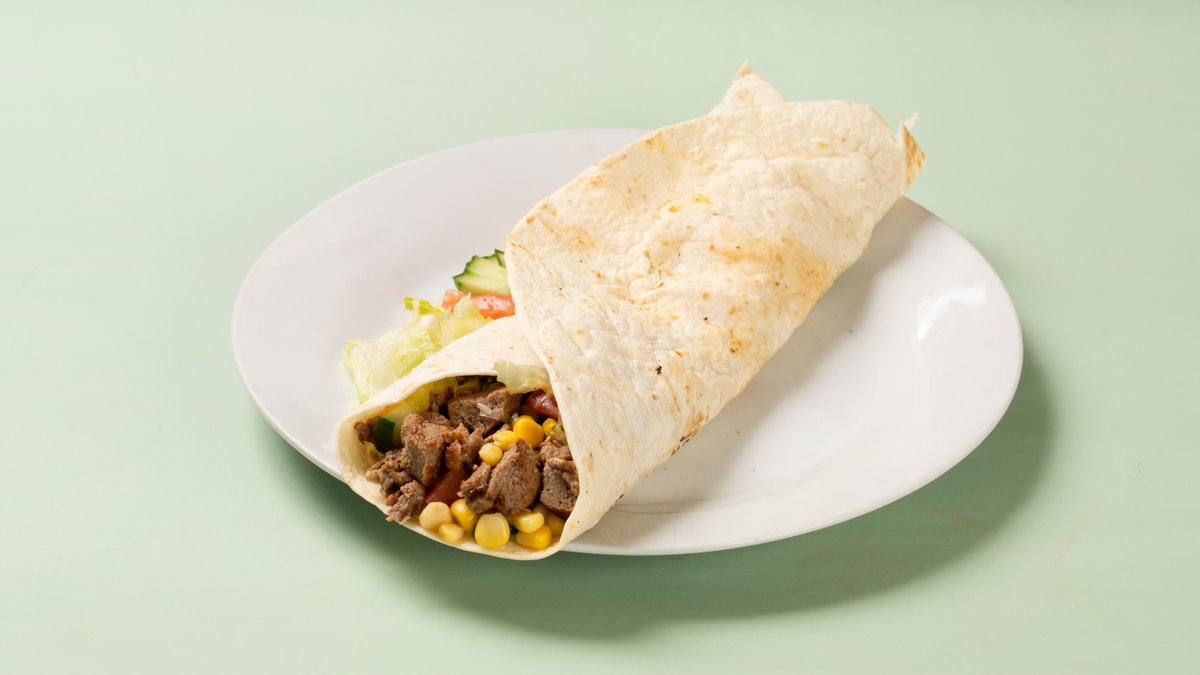 Biff i pita med mais, agurk, tomat, løk, isbergsalat og saus.