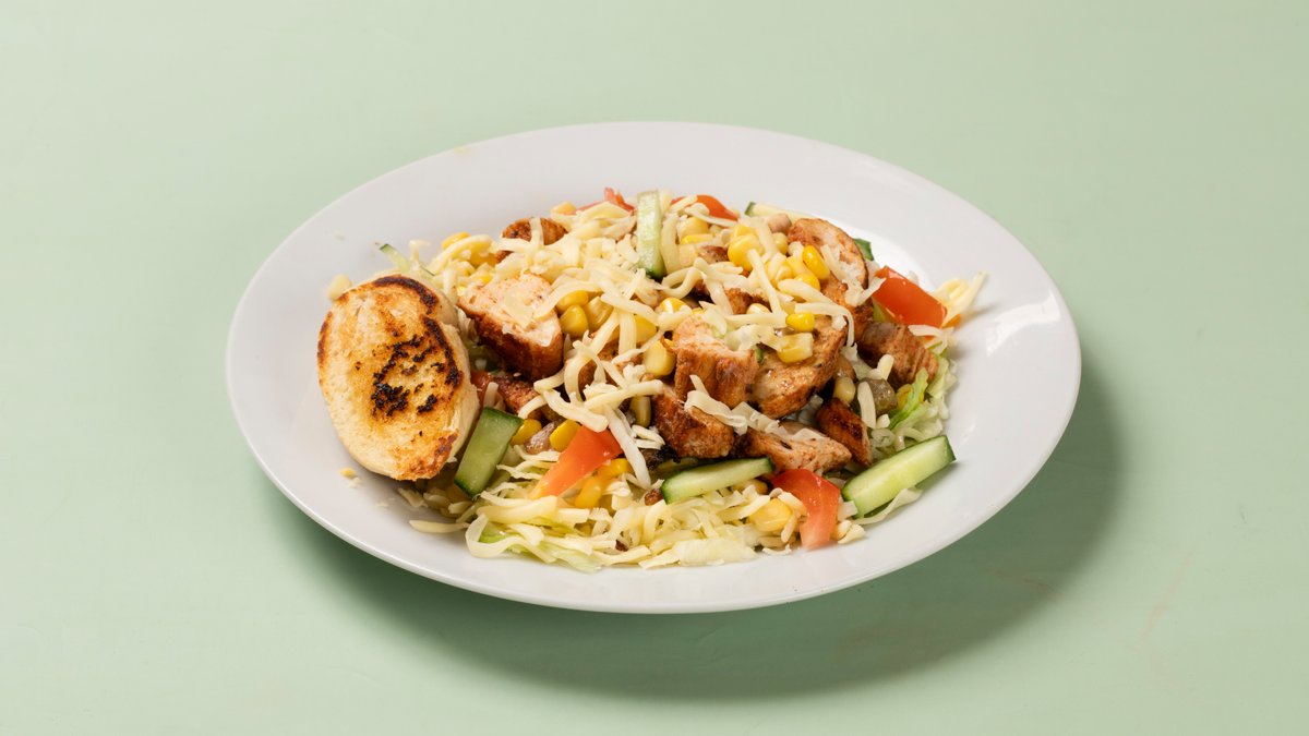 Kylling salat med kylling, salat, mais, agurk, tomat, løk, paprika, sopp, ost og dressing.