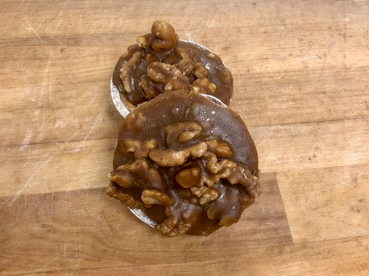 Valnøtter i karamell på en mørdeigsform med mazarin.
