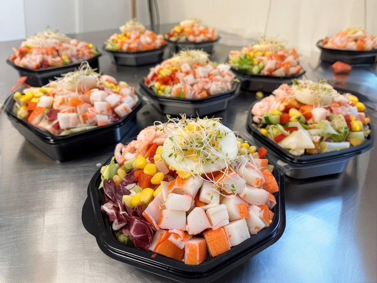Serveres med salat, agurk, paprika, mais, ananas, reker, crabsticks, egg og spirer Tilbehør følger med: rundstykke, smør og dressing Kan bestilles med glutenfritt rundstykke.