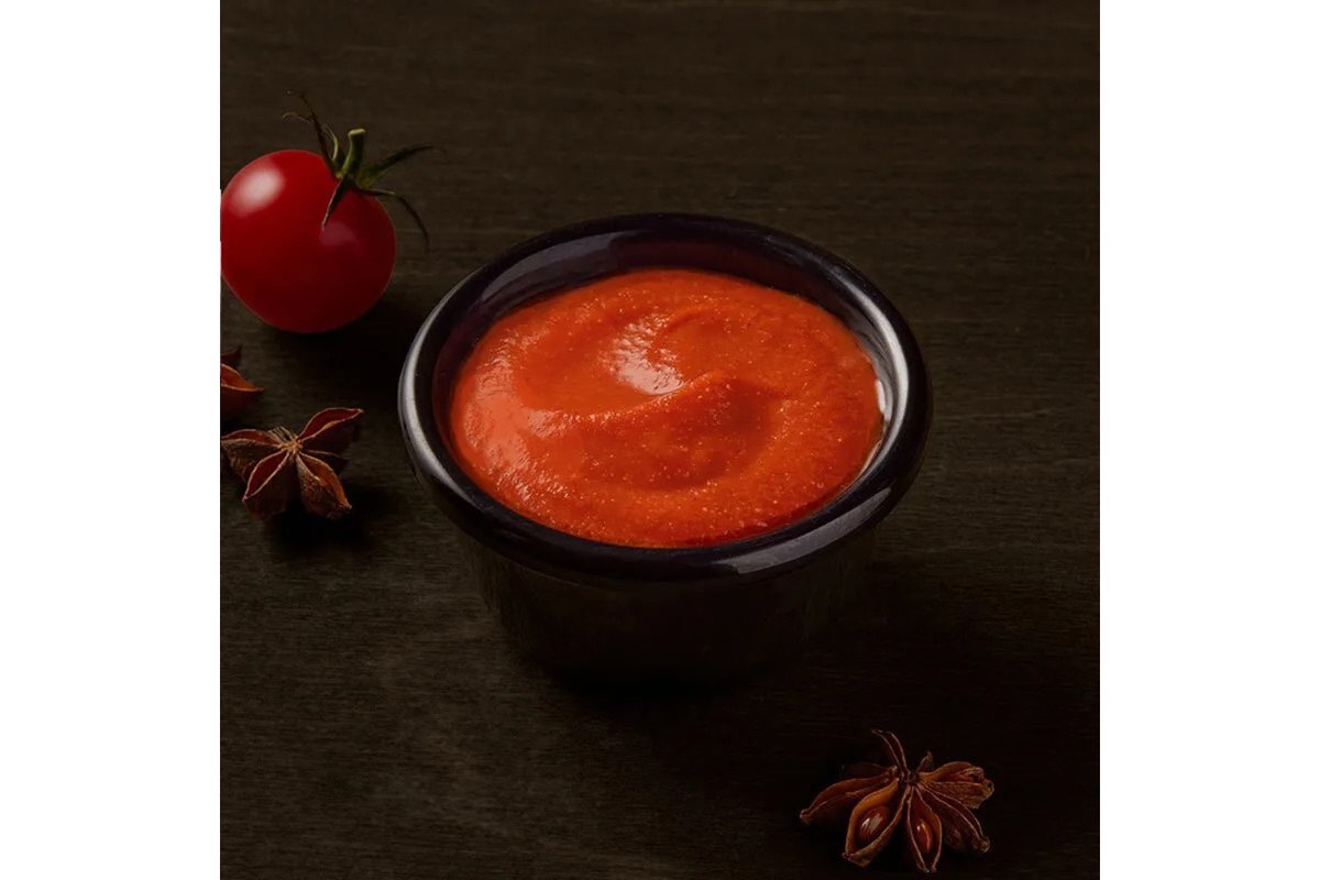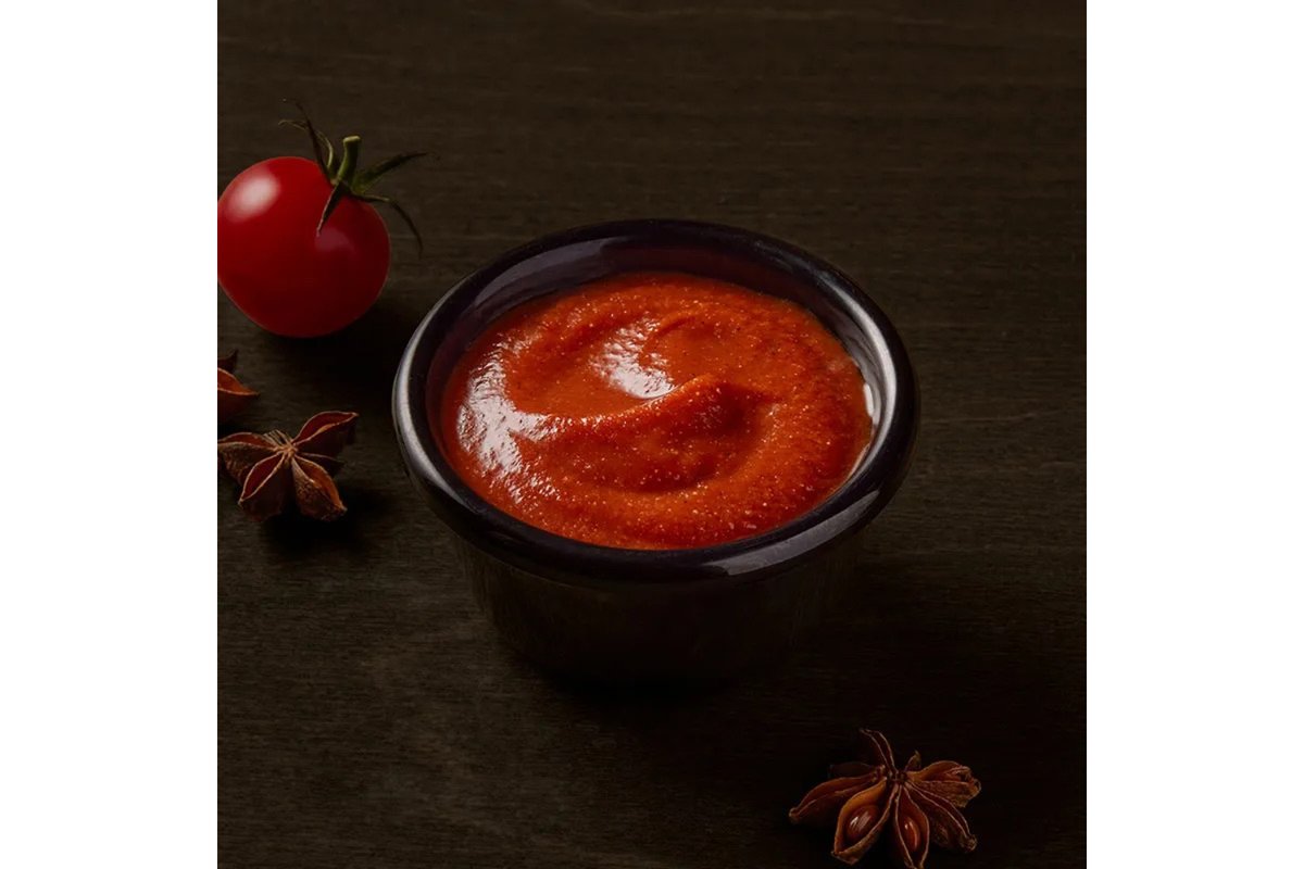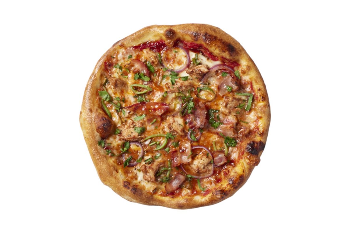 Tomatsaus, mozzarella, BBQ-marinert kyllingfilet, BBQ-saus, bacon, purre, rødløk. Toppes med nykvernet pepper og hakket bladpersille.