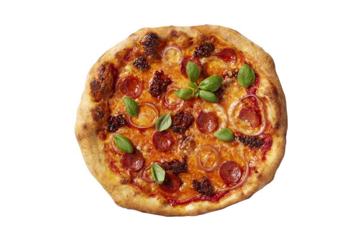 Tomatsaus, mozzarella, 'nduja, pepperoni og rødløk. Toppes med fersk basilikum.