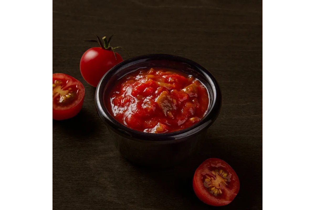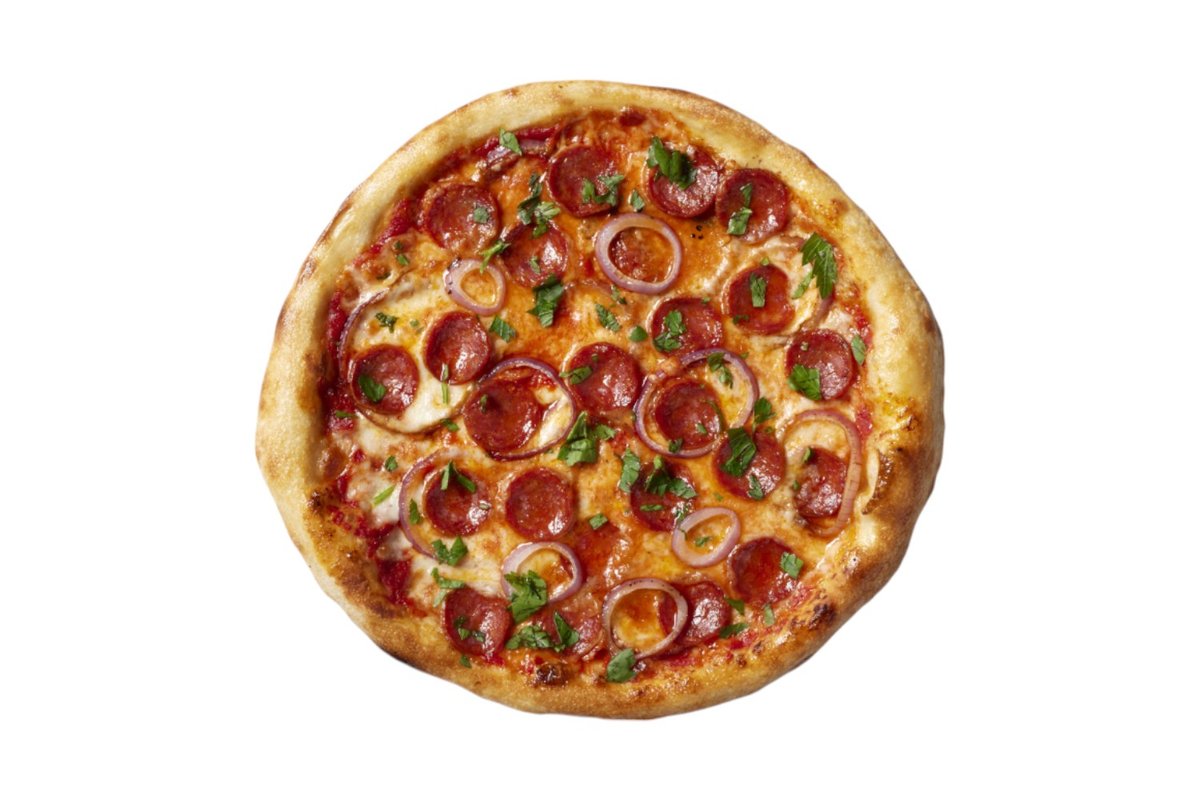 Tomatsaus, mozzarella, pepperoni, rødløk og hakket bladpersille.