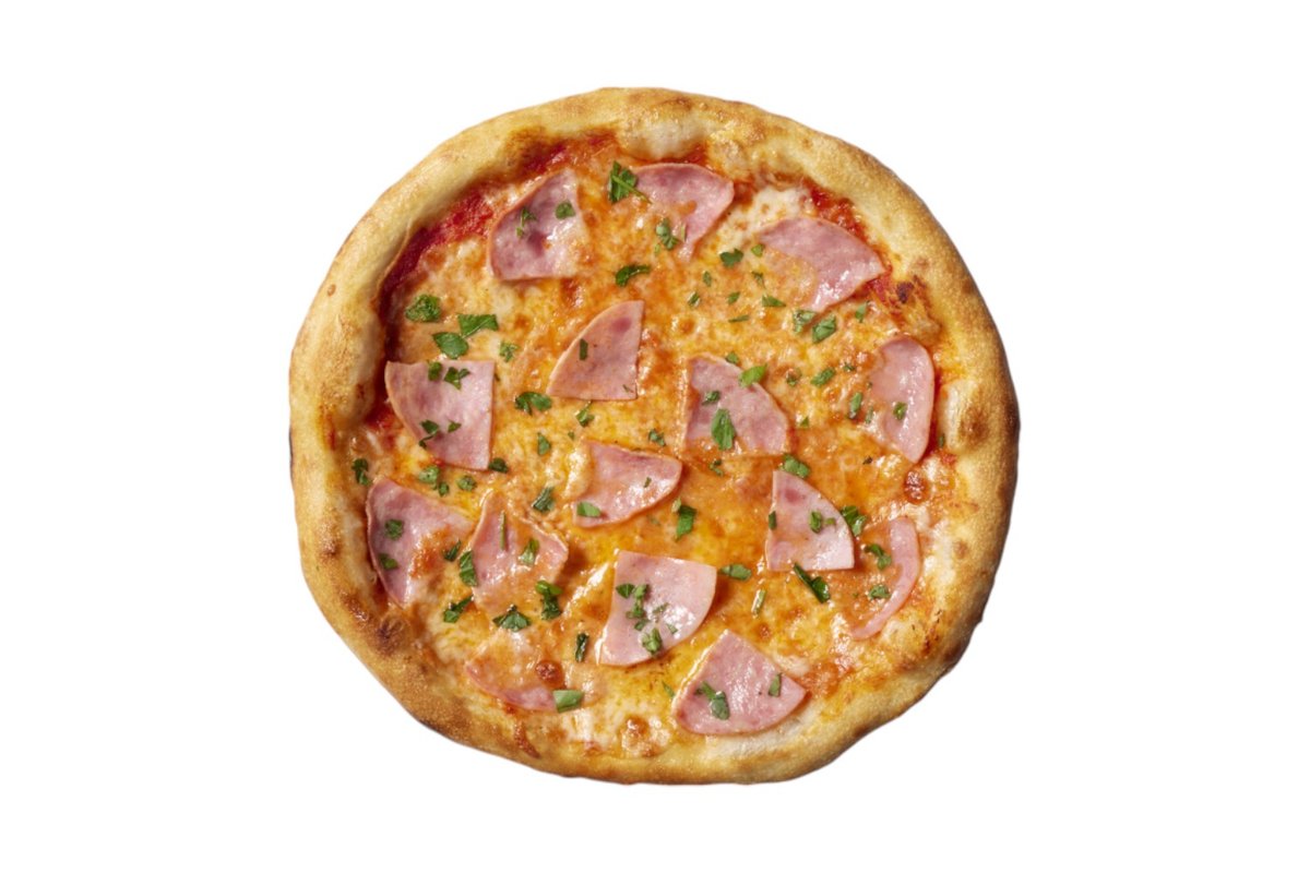 Tomatsaus, mozzarella, skinke og hakket bladpersille.